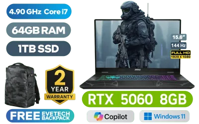 MSI Cyborg 15 B13WFKG Intel Core i7-13620H up to 4.90GHz Processor, 24MB Cache, 10x Cores, 16x Threads / 64GB DDR5 RAM / 1TB NVMe PCIe SSD / 15.6" Full HD (1920 x 1080) 144Hz IPS-Level Display / NVIDIA GeForce RTX 5060 GDDR7 8GB Graphics / Windows 11 Home / Intel Wi-Fi 6E AX211 Wireless LAN / Bluetooth 5.3 / 720p HD Webcam / 2x USB Type-A / 1x USB Type-C (Supports DisplayPort / Power Delivery 3.0) / 1x HDMI / 1x RJ-45 Ethernet LAN / 1x Headphone & Microphone Combo Jack / Kensington Lock / 4-Zone RGB Gaming Keyboard / 2x 2W Speakers / 2-Year Warranty / MSI Cyborg 15 B13WFKG Intel Core i7 RTX 5060 Gaming LaptopMSI Cyborg 15 B13WFKG Intel Core i7-13620H up to 4.90GHz Processor, 24MB Cache, 10x Cores, 16x Threads / 64GB DDR5 RAM / 1TB NVMe PCIe SSD / 15.6" Full HD (1920 x 1080) 144Hz IPS-Level Display / NVIDIA GeForce RTX 5060 GDDR7 8GB Graphics / Windows 11 Home / Intel Wi-Fi 6E AX211 Wireless LAN / Bluetooth 5.3 / 720p HD Webcam / 2x USB Type-A / 1x USB Type-C (Supports DisplayPort / Power Delivery 3.0) / 1x HDMI / 1x RJ-45 Ethernet LAN / 1x Headphone & Microphone Combo Jack / Kensington Lock / 4-Zone RGB Gaming Keyboard / 2x 2W Speakers / 2-Year Warranty / MSI Cyborg 15 B13WFKG Intel Core i7 RTX 5060 Gaming Laptop [Cyborg-15-B13WFKG-473ZA/64GB/1TB] / [+] GET FREE EVETECH DASH Premium Gaming Backpack+ FREE DELIVERY !