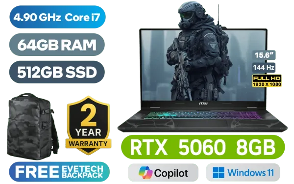 MSI Cyborg 15 B13WFKG Intel Core i7-13620H up to 4.90GHz Processor, 24MB Cache, 10x Cores, 16x Threads / 64GB DDR5 RAM / 512GB NVMe PCIe SSD / 15.6" Full HD (1920 x 1080) 144Hz IPS-Level Display / NVIDIA GeForce RTX 5060 GDDR7 8GB Graphics / Windows 11 Home / Intel Wi-Fi 6E AX211 Wireless LAN / Bluetooth 5.3 / 720p HD Webcam / 2x USB Type-A / 1x USB Type-C (Supports DisplayPort / Power Delivery 3.0) / 1x HDMI / 1x RJ-45 Ethernet LAN / 1x Headphone & Microphone Combo Jack / Kensington Lock / 4-Zone RGB Gaming Keyboard / 2x 2W Speakers / 2-Year Warranty / MSI Cyborg 15 B13WFKG Intel Core i7 RTX 5060 Gaming LaptopMSI Cyborg 15 B13WFKG Intel Core i7-13620H up to 4.90GHz Processor, 24MB Cache, 10x Cores, 16x Threads / 64GB DDR5 RAM / 512GB NVMe PCIe SSD / 15.6" Full HD (1920 x 1080) 144Hz IPS-Level Display / NVIDIA GeForce RTX 5060 GDDR7 8GB Graphics / Windows 11 Home / Intel Wi-Fi 6E AX211 Wireless LAN / Bluetooth 5.3 / 720p HD Webcam / 2x USB Type-A / 1x USB Type-C (Supports DisplayPort / Power Delivery 3.0) / 1x HDMI / 1x RJ-45 Ethernet LAN / 1x Headphone & Microphone Combo Jack / Kensington Lock / 4-Zone RGB Gaming Keyboard / 2x 2W Speakers / 2-Year Warranty / MSI Cyborg 15 B13WFKG Intel Core i7 RTX 5060 Gaming Laptop [Cyborg-15-B13WFKG-473ZA/64GB] / [+] GET FREE EVETECH DASH Premium Gaming Backpack+ FREE DELIVERY !