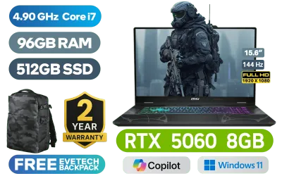 MSI Cyborg 15 B13WFKG Intel Core i7-13620H up to 4.90GHz Processor, 24MB Cache, 10x Cores, 16x Threads / 96GB DDR5 RAM / 512GB NVMe PCIe SSD / 15.6" Full HD (1920 x 1080) 144Hz IPS-Level Display / NVIDIA GeForce RTX 5060 GDDR7 8GB Graphics / Windows 11 Home / Intel Wi-Fi 6E AX211 Wireless LAN / Bluetooth 5.3 / 720p HD Webcam / 2x USB Type-A / 1x USB Type-C (Supports DisplayPort / Power Delivery 3.0) / 1x HDMI / 1x RJ-45 Ethernet LAN / 1x Headphone & Microphone Combo Jack / Kensington Lock / 4-Zone RGB Gaming Keyboard / 2x 2W Speakers / 2-Year Warranty / MSI Cyborg 15 B13WFKG Intel Core i7 RTX 5060 Gaming LaptopMSI Cyborg 15 B13WFKG Intel Core i7-13620H up to 4.90GHz Processor, 24MB Cache, 10x Cores, 16x Threads / 96GB DDR5 RAM / 512GB NVMe PCIe SSD / 15.6" Full HD (1920 x 1080) 144Hz IPS-Level Display / NVIDIA GeForce RTX 5060 GDDR7 8GB Graphics / Windows 11 Home / Intel Wi-Fi 6E AX211 Wireless LAN / Bluetooth 5.3 / 720p HD Webcam / 2x USB Type-A / 1x USB Type-C (Supports DisplayPort / Power Delivery 3.0) / 1x HDMI / 1x RJ-45 Ethernet LAN / 1x Headphone & Microphone Combo Jack / Kensington Lock / 4-Zone RGB Gaming Keyboard / 2x 2W Speakers / 2-Year Warranty / MSI Cyborg 15 B13WFKG Intel Core i7 RTX 5060 Gaming Laptop [Cyborg-15-B13WFKG-473ZA/96GB] / [+] GET FREE EVETECH DASH Premium Gaming Backpack+ FREE DELIVERY !