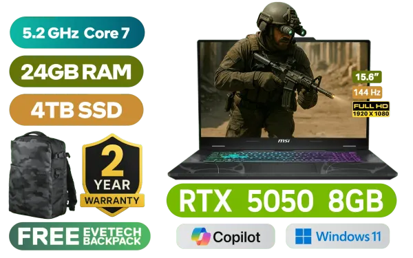 MSI Cyborg 15 B2RWEKG Intel® Core™ 7-240H up to 5.2GHz Processor, 24MB Cache, 10x Cores, 16x Threads / 24GB DDR5 RAM / 4TB Ultra-Fast NVMe SSD / 15.6" FHD (1920x1080) 144Hz IPS-Level Display / NVIDIA GeForce RTX 5050 8GB GDDR7 Dedicated Graphics / Windows 11 Home (64bit) / 720p HD Web Camera / Bluetooth 5.3 / Intel Wi-Fi 6E AX211 Wireless LAN / 2 x USB Type-A / 1 x USB Type-C (DisplayPort™/ Power Delivery 3.0) / 1 x HDMI / 1x RJ-45 / 1x Headphone and Microphone Combo Jack / 2x2W Speakers with DTS Audio / RGB Backlit Keyboard / 2 Years MSI Warranty / MSI Cyborg 15 B2RWEKG Intel® Core™ 7 RTX 5050 Gaming Laptop DealMSI Cyborg 15 B2RWEKG Intel® Core™ 7-240H up to 5.2GHz Processor, 24MB Cache, 10x Cores, 16x Threads / 24GB DDR5 RAM / 4TB Ultra-Fast NVMe SSD / 15.6" FHD (1920x1080) 144Hz IPS-Level Display / NVIDIA GeForce RTX 5050 8GB GDDR7 Dedicated Graphics / Windows 11 Home (64bit) / 720p HD Web Camera / Bluetooth 5.3 / Intel Wi-Fi 6E AX211 Wireless LAN / 2 x USB Type-A / 1 x USB Type-C (DisplayPort™/ Power Delivery 3.0) / 1 x HDMI / 1x RJ-45 / 1x Headphone and Microphone Combo Jack / 2x2W Speakers with DTS Audio / RGB Backlit Keyboard / 2 Years MSI Warranty / MSI Cyborg 15 B2RWEKG Intel® Core™ 7 RTX 5050 Gaming Laptop Deal [MSI-Cyborg-15-B2RWEKG-092ZA/24GB/4TB] / [+] GET FREE Promate AudioFit Open Ear Clip On TWS Earbuds / [+] GET FREE EVETECH DASH Premium Gaming Backpack+ FREE DELIVERY !