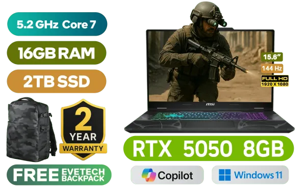 MSI Cyborg 15 B2RWEKG Intel® Core™ 7-240H up to 5.2GHz Processor, 24MB Cache, 10x Cores, 16x Threads / 16GB DDR5 RAM / 2TB Ultra-Fast NVMe SSD / 15.6" FHD (1920x1080) 144Hz IPS-Level Display / NVIDIA GeForce RTX 5050 8GB GDDR7 Dedicated Graphics / Windows 11 Home (64bit) / 720p HD Web Camera / Bluetooth 5.3 / Intel Wi-Fi 6E AX211 Wireless LAN / 2 x USB Type-A / 1 x USB Type-C (DisplayPort™/ Power Delivery 3.0) / 1 x HDMI / 1x RJ-45 / 1x Headphone and Microphone Combo Jack / 2x2W Speakers with DTS Audio / RGB Backlit Keyboard / 2 Years MSI Warranty / MSI Cyborg 15 B2RWEKG Intel® Core™ 7 RTX 5050 Gaming Laptop DealMSI Cyborg 15 B2RWEKG Intel® Core™ 7-240H up to 5.2GHz Processor, 24MB Cache, 10x Cores, 16x Threads / 16GB DDR5 RAM / 2TB Ultra-Fast NVMe SSD / 15.6" FHD (1920x1080) 144Hz IPS-Level Display / NVIDIA GeForce RTX 5050 8GB GDDR7 Dedicated Graphics / Windows 11 Home (64bit) / 720p HD Web Camera / Bluetooth 5.3 / Intel Wi-Fi 6E AX211 Wireless LAN / 2 x USB Type-A / 1 x USB Type-C (DisplayPort™/ Power Delivery 3.0) / 1 x HDMI / 1x RJ-45 / 1x Headphone and Microphone Combo Jack / 2x2W Speakers with DTS Audio / RGB Backlit Keyboard / 2 Years MSI Warranty / MSI Cyborg 15 B2RWEKG Intel® Core™ 7 RTX 5050 Gaming Laptop Deal [MSI-Cyborg-15-B2RWEKG-092ZA/2TB] / [+] GET FREE Promate AudioFit Open Ear Clip On TWS Earbuds / [+] GET FREE EVETECH DASH Premium Gaming Backpack+ FREE DELIVERY !