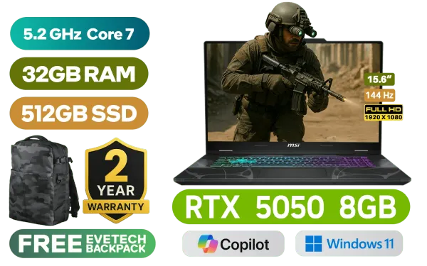 MSI Cyborg 15 B2RWEKG Intel® Core™ 7-240H up to 5.2GHz Processor, 24MB Cache, 10x Cores, 16x Threads / 32GB DDR5 RAM / 512GB Ultra-Fast NVMe SSD / 15.6" FHD (1920x1080) 144Hz IPS-Level Display / NVIDIA GeForce RTX 5050 8GB GDDR7 Dedicated Graphics / Windows 11 Home (64bit) / 720p HD Web Camera / Bluetooth 5.3 / Intel Wi-Fi 6E AX211 Wireless LAN / 2 x USB Type-A / 1 x USB Type-C (DisplayPort™/ Power Delivery 3.0) / 1 x HDMI / 1x RJ-45 / 1x Headphone and Microphone Combo Jack / 2x2W Speakers with DTS Audio / RGB Backlit Keyboard / 2 Years MSI Warranty / MSI Cyborg 15 B2RWEKG Intel® Core™ 7 RTX 5050 Gaming Laptop DealMSI Cyborg 15 B2RWEKG Intel® Core™ 7-240H up to 5.2GHz Processor, 24MB Cache, 10x Cores, 16x Threads / 32GB DDR5 RAM / 512GB Ultra-Fast NVMe SSD / 15.6" FHD (1920x1080) 144Hz IPS-Level Display / NVIDIA GeForce RTX 5050 8GB GDDR7 Dedicated Graphics / Windows 11 Home (64bit) / 720p HD Web Camera / Bluetooth 5.3 / Intel Wi-Fi 6E AX211 Wireless LAN / 2 x USB Type-A / 1 x USB Type-C (DisplayPort™/ Power Delivery 3.0) / 1 x HDMI / 1x RJ-45 / 1x Headphone and Microphone Combo Jack / 2x2W Speakers with DTS Audio / RGB Backlit Keyboard / 2 Years MSI Warranty / MSI Cyborg 15 B2RWEKG Intel® Core™ 7 RTX 5050 Gaming Laptop Deal [MSI-Cyborg-15-B2RWEKG-092ZA/32GB] / [+] GET FREE Promate AudioFit Open Ear Clip On TWS Earbuds / [+] GET FREE EVETECH DASH Premium Gaming Backpack+ FREE DELIVERY !