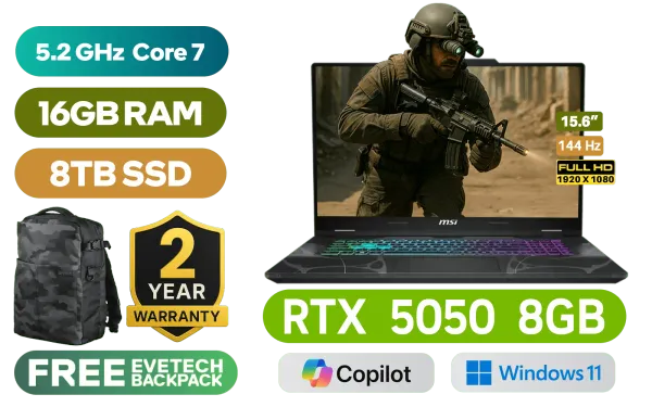 MSI Cyborg 15 B2RWEKG Intel® Core™ 7-240H up to 5.2GHz Processor, 24MB Cache, 10x Cores, 16x Threads / 16GB DDR5 RAM / 8TB Ultra-Fast NVMe SSD / 15.6" FHD (1920x1080) 144Hz IPS-Level Display / NVIDIA GeForce RTX 5050 8GB GDDR7 Dedicated Graphics / Windows 11 Home (64bit) / 720p HD Web Camera / Bluetooth 5.3 / Intel Wi-Fi 6E AX211 Wireless LAN / 2 x USB Type-A / 1 x USB Type-C (DisplayPort™/ Power Delivery 3.0) / 1 x HDMI / 1x RJ-45 / 1x Headphone and Microphone Combo Jack / 2x2W Speakers with DTS Audio / RGB Backlit Keyboard / 2 Years MSI Warranty / MSI Cyborg 15 B2RWEKG Intel® Core™ 7 RTX 5050 Gaming Laptop DealMSI Cyborg 15 B2RWEKG Intel® Core™ 7-240H up to 5.2GHz Processor, 24MB Cache, 10x Cores, 16x Threads / 16GB DDR5 RAM / 8TB Ultra-Fast NVMe SSD / 15.6" FHD (1920x1080) 144Hz IPS-Level Display / NVIDIA GeForce RTX 5050 8GB GDDR7 Dedicated Graphics / Windows 11 Home (64bit) / 720p HD Web Camera / Bluetooth 5.3 / Intel Wi-Fi 6E AX211 Wireless LAN / 2 x USB Type-A / 1 x USB Type-C (DisplayPort™/ Power Delivery 3.0) / 1 x HDMI / 1x RJ-45 / 1x Headphone and Microphone Combo Jack / 2x2W Speakers with DTS Audio / RGB Backlit Keyboard / 2 Years MSI Warranty / MSI Cyborg 15 B2RWEKG Intel® Core™ 7 RTX 5050 Gaming Laptop Deal [MSI-Cyborg-15-B2RWEKG-092ZA/8TB] / [+] GET FREE Promate AudioFit Open Ear Clip On TWS Earbuds / [+] GET FREE EVETECH DASH Premium Gaming Backpack+ FREE DELIVERY !