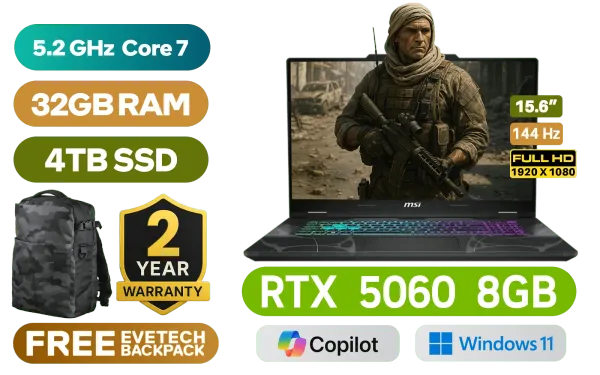 MSI Cyborg 15 B2RWFKG Intel® Core™ 7-240H up to 5.2GHz Processor, 24MB Cache, 10x Cores, 16x Threads / 32GB DDR5 RAM / 4TB Ultra-Fast NVMe SSD / 15.6" FHD (1920x1080) 144Hz IPS-Level Display / NVIDIA GeForce RTX 5060 8GB GDDR7 Dedicated Graphics / Windows 11 Home (64bit) / 720p HD Web Camera / Bluetooth 5.3 / Intel Wi-Fi 6E AX211 Wireless LAN / 2 x USB Type-A / 1 x USB Type-C (DisplayPort™/ Power Delivery 3.0) / 1 x HDMI / 1x RJ-45 / 1x Headphone and Microphone Combo Jack / 2x2w Speakers with DTS Audio / RGB Backlit Keyboard / 2 Years MSI Warranty / MSI Cyborg 15 B2RWFKG Intel® Core™ 7 RTX 5060 Gaming Laptop DealMSI Cyborg 15 B2RWFKG Intel® Core™ 7-240H up to 5.2GHz Processor, 24MB Cache, 10x Cores, 16x Threads / 32GB DDR5 RAM / 4TB Ultra-Fast NVMe SSD / 15.6" FHD (1920x1080) 144Hz IPS-Level Display / NVIDIA GeForce RTX 5060 8GB GDDR7 Dedicated Graphics / Windows 11 Home (64bit) / 720p HD Web Camera / Bluetooth 5.3 / Intel Wi-Fi 6E AX211 Wireless LAN / 2 x USB Type-A / 1 x USB Type-C (DisplayPort™/ Power Delivery 3.0) / 1 x HDMI / 1x RJ-45 / 1x Headphone and Microphone Combo Jack / 2x2w Speakers with DTS Audio / RGB Backlit Keyboard / 2 Years MSI Warranty / MSI Cyborg 15 B2RWFKG Intel® Core™ 7 RTX 5060 Gaming Laptop Deal [MSI-Cyborg-15-B2RWFKG-091ZA/32GB/4TB] / [+] GET FREE Promate AudioFit Open Ear Clip On TWS Earbuds / [+] GET FREE EVETECH DASH Premium Gaming Backpack+ FREE DELIVERY !