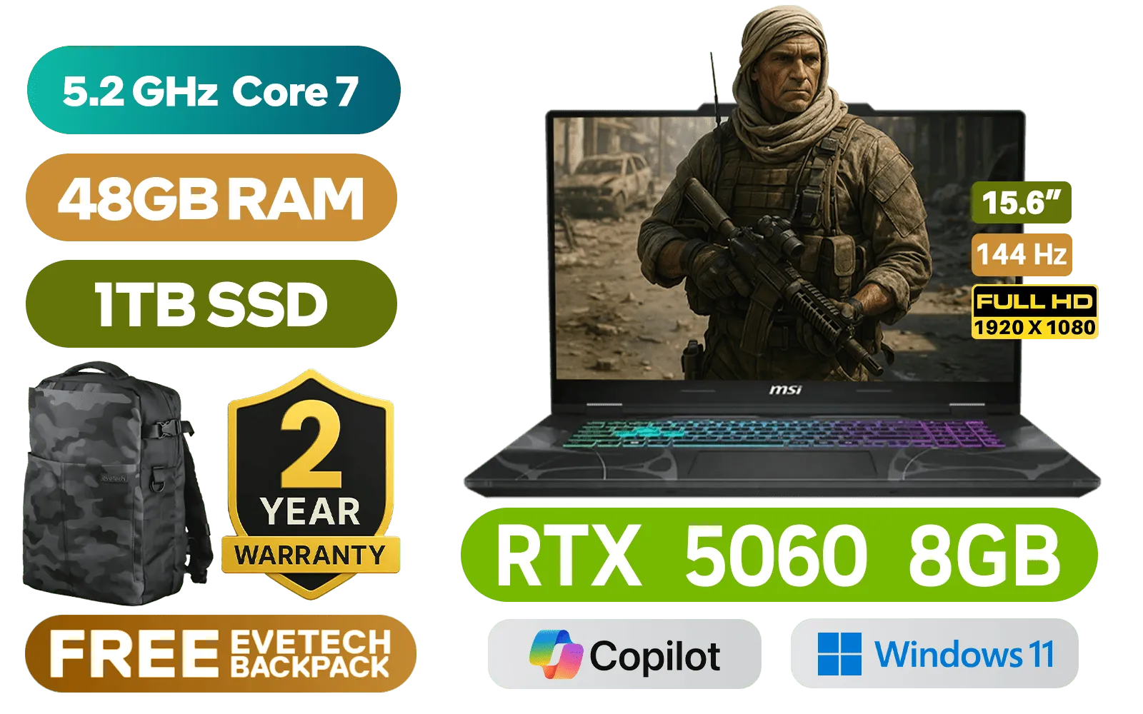 MSI Cyborg 15 B2RWFKG Intel® Core™ 7-240H up to 5.2GHz Processor, 24MB Cache, 10x Cores, 16x Threads / 48GB DDR5 RAM / 1TB Ultra-Fast NVMe SSD / 15.6" FHD (1920x1080) 144Hz IPS-Level Display / NVIDIA GeForce RTX 5060 8GB GDDR7 Dedicated Graphics / Windows 11 Home (64bit) / 720p HD Web Camera / Bluetooth 5.3 / Intel Wi-Fi 6E AX211 Wireless LAN / 2 x USB Type-A / 1 x USB Type-C (DisplayPort™/ Power Delivery 3.0) / 1 x HDMI / 1x RJ-45 / 1x Headphone and Microphone Combo Jack / 2x2w Speakers with DTS Audio / RGB Backlit Keyboard / 2 Years MSI Warranty / MSI Cyborg 15 B2RWFKG Intel® Core™ 7 RTX 5060 Gaming Laptop DealMSI Cyborg 15 B2RWFKG Intel® Core™ 7-240H up to 5.2GHz Processor, 24MB Cache, 10x Cores, 16x Threads / 48GB DDR5 RAM / 1TB Ultra-Fast NVMe SSD / 15.6" FHD (1920x1080) 144Hz IPS-Level Display / NVIDIA GeForce RTX 5060 8GB GDDR7 Dedicated Graphics / Windows 11 Home (64bit) / 720p HD Web Camera / Bluetooth 5.3 / Intel Wi-Fi 6E AX211 Wireless LAN / 2 x USB Type-A / 1 x USB Type-C (DisplayPort™/ Power Delivery 3.0) / 1 x HDMI / 1x RJ-45 / 1x Headphone and Microphone Combo Jack / 2x2w Speakers with DTS Audio / RGB Backlit Keyboard / 2 Years MSI Warranty / MSI Cyborg 15 B2RWFKG Intel® Core™ 7 RTX 5060 Gaming Laptop Deal [MSI-Cyborg-15-B2RWFKG-091ZA/48GB/1TB] / [+] GET FREE Promate AudioFit Open Ear Clip On TWS Earbuds / [+] GET FREE EVETECH DASH Premium Gaming Backpack+ FREE DELIVERY !