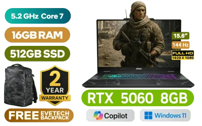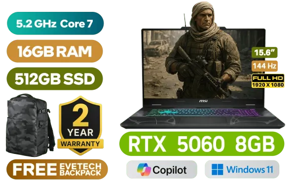 MSI Cyborg 15 B2RWFKG Intel® Core™ 7-240H up to 5.2GHz Processor, 24MB Cache, 10x Cores, 16x Threads / 16GB DDR5 RAM / 512GB Ultra-Fast NVMe SSD / 15.6" FHD (1920x1080) 144Hz IPS-Level Display / NVIDIA GeForce RTX 5060 8GB GDDR7 Dedicated Graphics / Windows 11 Home (64bit) / 720p HD Web Camera / Bluetooth 5.3 / Intel Wi-Fi 6E AX211 Wireless LAN / 2 x USB Type-A / 1 x USB Type-C (DisplayPort™/ Power Delivery 3.0) / 1 x HDMI / 1x RJ-45 / 1x Headphone and Microphone Combo Jack / 2x2w Speakers with DTS Audio / RGB Backlit Keyboard / 2 Years MSI Warranty / MSI Cyborg 15 B2RWFKG Intel® Core™ 7 RTX 5060 Gaming Laptop DealMSI Cyborg 15 B2RWFKG Intel® Core™ 7-240H up to 5.2GHz Processor, 24MB Cache, 10x Cores, 16x Threads / 16GB DDR5 RAM / 512GB Ultra-Fast NVMe SSD / 15.6" FHD (1920x1080) 144Hz IPS-Level Display / NVIDIA GeForce RTX 5060 8GB GDDR7 Dedicated Graphics / Windows 11 Home (64bit) / 720p HD Web Camera / Bluetooth 5.3 / Intel Wi-Fi 6E AX211 Wireless LAN / 2 x USB Type-A / 1 x USB Type-C (DisplayPort™/ Power Delivery 3.0) / 1 x HDMI / 1x RJ-45 / 1x Headphone and Microphone Combo Jack / 2x2w Speakers with DTS Audio / RGB Backlit Keyboard / 2 Years MSI Warranty / MSI Cyborg 15 B2RWFKG Intel® Core™ 7 RTX 5060 Gaming Laptop Deal [MSI-Cyborg-15-B2RWFKG-091ZA] / [+] GET FREE Promate AudioFit Open Ear Clip On TWS Earbuds / [+] GET FREE EVETECH DASH Premium Gaming Backpack+ FREE DELIVERY !