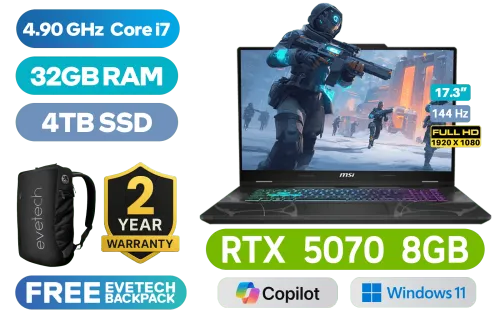 MSI CYBORG 17 B13WGKG Intel Core i7-13620H up to 4.90GHz Processor, 24MB Cache, 10x Cores, 16x Threads / 32GB DDR5 RAM / 4TB Ultra-Fast NVMe SSD / 17.3" FHD (1920 x 1080) 144Hz IPS-Level Display / NVIDIA GeForce RTX 5070 GDDR7 8GB Graphics / Windows 11 Home / Intel Wi-Fi 6E Wireless LAN / Bluetooth 5.3 / 720p HD Camera with Webcam Shutter / 2x Type-A USB / 1x Type-C (Supports DisplayPort / Power Delivery 3.0) / 1x HDMI 2.1 / 1x RJ-45 Ethernet LAN / Kensington Lock / 4-Zone RGB Gaming Keyboard / 2-Year Warranty / MSI Cyborg 17 B13WGKG Intel Core i7 RTX 5070 Gaming LaptopMSI CYBORG 17 B13WGKG Intel Core i7-13620H up to 4.90GHz Processor, 24MB Cache, 10x Cores, 16x Threads / 32GB DDR5 RAM / 4TB Ultra-Fast NVMe SSD / 17.3" FHD (1920 x 1080) 144Hz IPS-Level Display / NVIDIA GeForce RTX 5070 GDDR7 8GB Graphics / Windows 11 Home / Intel Wi-Fi 6E Wireless LAN / Bluetooth 5.3 / 720p HD Camera with Webcam Shutter / 2x Type-A USB / 1x Type-C (Supports DisplayPort / Power Delivery 3.0) / 1x HDMI 2.1 / 1x RJ-45 Ethernet LAN / Kensington Lock / 4-Zone RGB Gaming Keyboard / 2-Year Warranty / MSI Cyborg 17 B13WGKG Intel Core i7 RTX 5070 Gaming Laptop [Cyborg-17-B13WGKG-089ZA/4TB] / [+] GET FREE EVETECH NEO Premium Gaming Backpack / [+]Get Resident Evil: Requiem with select GeForce RTX 50 Series (Standard Edition)+ FREE DELIVERY !