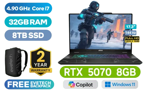 MSI CYBORG 17 B13WGKG Intel Core i7-13620H up to 4.90GHz Processor, 24MB Cache, 10x Cores, 16x Threads / 32GB DDR5 RAM / 8TB Ultra-Fast NVMe SSD / 17.3" FHD (1920 x 1080) 144Hz IPS-Level Display / NVIDIA GeForce RTX 5070 GDDR7 8GB Graphics / Windows 11 Home / Intel Wi-Fi 6E Wireless LAN / Bluetooth 5.3 / 720p HD Camera with Webcam Shutter / 2x Type-A USB / 1x Type-C (Supports DisplayPort / Power Delivery 3.0) / 1x HDMI 2.1 / 1x RJ-45 Ethernet LAN / Kensington Lock / 4-Zone RGB Gaming Keyboard / 2-Year Warranty / MSI Cyborg 17 B13WGKG Intel Core i7 RTX 5070 Gaming LaptopMSI CYBORG 17 B13WGKG Intel Core i7-13620H up to 4.90GHz Processor, 24MB Cache, 10x Cores, 16x Threads / 32GB DDR5 RAM / 8TB Ultra-Fast NVMe SSD / 17.3" FHD (1920 x 1080) 144Hz IPS-Level Display / NVIDIA GeForce RTX 5070 GDDR7 8GB Graphics / Windows 11 Home / Intel Wi-Fi 6E Wireless LAN / Bluetooth 5.3 / 720p HD Camera with Webcam Shutter / 2x Type-A USB / 1x Type-C (Supports DisplayPort / Power Delivery 3.0) / 1x HDMI 2.1 / 1x RJ-45 Ethernet LAN / Kensington Lock / 4-Zone RGB Gaming Keyboard / 2-Year Warranty / MSI Cyborg 17 B13WGKG Intel Core i7 RTX 5070 Gaming Laptop [Cyborg-17-B13WGKG-089ZA/8TB] / [+] GET FREE EVETECH NEO Premium Gaming Backpack / [+]Get Resident Evil: Requiem with select GeForce RTX 50 Series (Standard Edition)+ FREE DELIVERY !