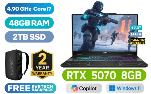 MSI CYBORG 17 B13WGKG Intel Core i7-13620H up to 4.90GHz Processor, 24MB Cache, 10x Cores, 16x Threads / 48GB DDR5 RAM / 2TB Ultra-Fast NVMe SSD / 17.3" FHD (1920 x 1080) 144Hz IPS-Level Display / NVIDIA GeForce RTX 5070 GDDR7 8GB Graphics / Windows 11 Home / Intel Wi-Fi 6E Wireless LAN / Bluetooth 5.3 / 720p HD Camera with Webcam Shutter / 2x Type-A USB / 1x Type-C (Supports DisplayPort / Power Delivery 3.0) / 1x HDMI 2.1 / 1x RJ-45 Ethernet LAN / Kensington Lock / 4-Zone RGB Gaming Keyboard / 2-Year Warranty / MSI Cyborg 17 B13WGKG Intel Core i7 RTX 5070 Gaming LaptopMSI CYBORG 17 B13WGKG Intel Core i7-13620H up to 4.90GHz Processor, 24MB Cache, 10x Cores, 16x Threads / 48GB DDR5 RAM / 2TB Ultra-Fast NVMe SSD / 17.3" FHD (1920 x 1080) 144Hz IPS-Level Display / NVIDIA GeForce RTX 5070 GDDR7 8GB Graphics / Windows 11 Home / Intel Wi-Fi 6E Wireless LAN / Bluetooth 5.3 / 720p HD Camera with Webcam Shutter / 2x Type-A USB / 1x Type-C (Supports DisplayPort / Power Delivery 3.0) / 1x HDMI 2.1 / 1x RJ-45 Ethernet LAN / Kensington Lock / 4-Zone RGB Gaming Keyboard / 2-Year Warranty / MSI Cyborg 17 B13WGKG Intel Core i7 RTX 5070 Gaming Laptop [Cyborg-17-B13WGKG-089ZA/48GB/2TB] / [+] GET FREE EVETECH NEO Premium Gaming Backpack / [+]Get Resident Evil: Requiem with select GeForce RTX 50 Series (Standard Edition)+ FREE DELIVERY !