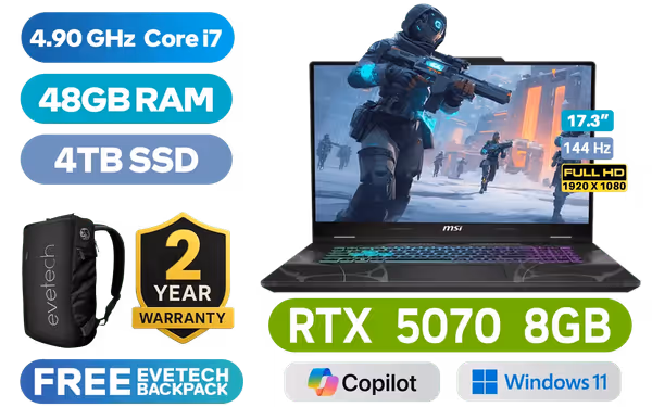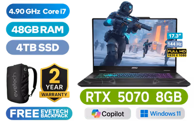MSI CYBORG 17 B13WGKG Intel Core i7-13620H up to 4.90GHz Processor, 24MB Cache, 10x Cores, 16x Threads / 48GB DDR5 RAM / 4TB Ultra-Fast NVMe SSD / 17.3" FHD (1920 x 1080) 144Hz IPS-Level Display / NVIDIA GeForce RTX 5070 GDDR7 8GB Graphics / Windows 11 Home / Intel Wi-Fi 6E Wireless LAN / Bluetooth 5.3 / 720p HD Camera with Webcam Shutter / 2x Type-A USB / 1x Type-C (Supports DisplayPort / Power Delivery 3.0) / 1x HDMI 2.1 / 1x RJ-45 Ethernet LAN / Kensington Lock / 4-Zone RGB Gaming Keyboard / 2-Year Warranty / MSI Cyborg 17 B13WGKG Intel Core i7 RTX 5070 Gaming LaptopMSI CYBORG 17 B13WGKG Intel Core i7-13620H up to 4.90GHz Processor, 24MB Cache, 10x Cores, 16x Threads / 48GB DDR5 RAM / 4TB Ultra-Fast NVMe SSD / 17.3" FHD (1920 x 1080) 144Hz IPS-Level Display / NVIDIA GeForce RTX 5070 GDDR7 8GB Graphics / Windows 11 Home / Intel Wi-Fi 6E Wireless LAN / Bluetooth 5.3 / 720p HD Camera with Webcam Shutter / 2x Type-A USB / 1x Type-C (Supports DisplayPort / Power Delivery 3.0) / 1x HDMI 2.1 / 1x RJ-45 Ethernet LAN / Kensington Lock / 4-Zone RGB Gaming Keyboard / 2-Year Warranty / MSI Cyborg 17 B13WGKG Intel Core i7 RTX 5070 Gaming Laptop [Cyborg-17-B13WGKG-089ZA/48GB/4TB] / [+] GET FREE EVETECH NEO Premium Gaming Backpack / [+] Get PRAGMATA with select GeForce RTX 50 Series + FREE DELIVERY !
