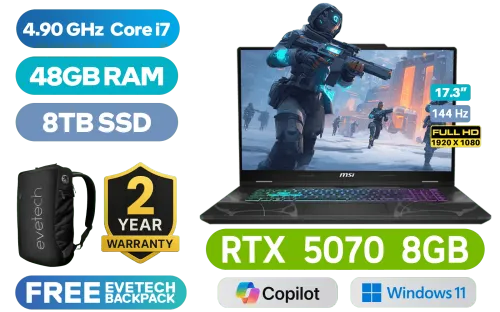 MSI CYBORG 17 B13WGKG Intel Core i7-13620H up to 4.90GHz Processor, 24MB Cache, 10x Cores, 16x Threads / 48GB DDR5 RAM / 8TB Ultra-Fast NVMe SSD / 17.3" FHD (1920 x 1080) 144Hz IPS-Level Display / NVIDIA GeForce RTX 5070 GDDR7 8GB Graphics / Windows 11 Home / Intel Wi-Fi 6E Wireless LAN / Bluetooth 5.3 / 720p HD Camera with Webcam Shutter / 2x Type-A USB / 1x Type-C (Supports DisplayPort / Power Delivery 3.0) / 1x HDMI 2.1 / 1x RJ-45 Ethernet LAN / Kensington Lock / 4-Zone RGB Gaming Keyboard / 2-Year Warranty / MSI Cyborg 17 B13WGKG Intel Core i7 RTX 5070 Gaming LaptopMSI CYBORG 17 B13WGKG Intel Core i7-13620H up to 4.90GHz Processor, 24MB Cache, 10x Cores, 16x Threads / 48GB DDR5 RAM / 8TB Ultra-Fast NVMe SSD / 17.3" FHD (1920 x 1080) 144Hz IPS-Level Display / NVIDIA GeForce RTX 5070 GDDR7 8GB Graphics / Windows 11 Home / Intel Wi-Fi 6E Wireless LAN / Bluetooth 5.3 / 720p HD Camera with Webcam Shutter / 2x Type-A USB / 1x Type-C (Supports DisplayPort / Power Delivery 3.0) / 1x HDMI 2.1 / 1x RJ-45 Ethernet LAN / Kensington Lock / 4-Zone RGB Gaming Keyboard / 2-Year Warranty / MSI Cyborg 17 B13WGKG Intel Core i7 RTX 5070 Gaming Laptop [Cyborg-17-B13WGKG-089ZA/48GB/8TB] / [+] GET FREE EVETECH NEO Premium Gaming Backpack / [+]Get Resident Evil: Requiem with select GeForce RTX 50 Series (Standard Edition)+ FREE DELIVERY !