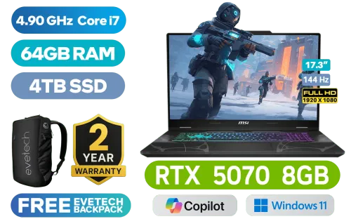 MSI CYBORG 17 B13WGKG Intel Core i7-13620H up to 4.90GHz Processor, 24MB Cache, 10x Cores, 16x Threads / 64GB DDR5 RAM / 4TB Ultra-Fast NVMe SSD / 17.3" FHD (1920 x 1080) 144Hz IPS-Level Display / NVIDIA GeForce RTX 5070 GDDR7 8GB Graphics / Windows 11 Home / Intel Wi-Fi 6E Wireless LAN / Bluetooth 5.3 / 720p HD Camera with Webcam Shutter / 2x Type-A USB / 1x Type-C (Supports DisplayPort / Power Delivery 3.0) / 1x HDMI 2.1 / 1x RJ-45 Ethernet LAN / Kensington Lock / 4-Zone RGB Gaming Keyboard / 2-Year Warranty / MSI Cyborg 17 B13WGKG Intel Core i7 RTX 5070 Gaming LaptopMSI CYBORG 17 B13WGKG Intel Core i7-13620H up to 4.90GHz Processor, 24MB Cache, 10x Cores, 16x Threads / 64GB DDR5 RAM / 4TB Ultra-Fast NVMe SSD / 17.3" FHD (1920 x 1080) 144Hz IPS-Level Display / NVIDIA GeForce RTX 5070 GDDR7 8GB Graphics / Windows 11 Home / Intel Wi-Fi 6E Wireless LAN / Bluetooth 5.3 / 720p HD Camera with Webcam Shutter / 2x Type-A USB / 1x Type-C (Supports DisplayPort / Power Delivery 3.0) / 1x HDMI 2.1 / 1x RJ-45 Ethernet LAN / Kensington Lock / 4-Zone RGB Gaming Keyboard / 2-Year Warranty / MSI Cyborg 17 B13WGKG Intel Core i7 RTX 5070 Gaming Laptop [Cyborg-17-B13WGKG-089ZA/64GB/4TB] / [+] GET FREE EVETECH NEO Premium Gaming Backpack / [+]Get Resident Evil: Requiem with select GeForce RTX 50 Series (Standard Edition)+ FREE DELIVERY !