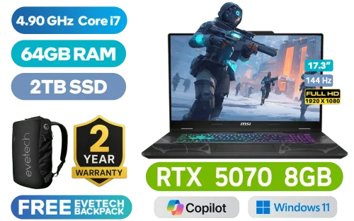 MSI CYBORG 17 B13WGKG Intel Core i7-13620H up to 4.90GHz Processor, 24MB Cache, 10x Cores, 16x Threads / 64GB DDR5 RAM / 2TB Ultra-Fast NVMe SSD / 17.3" FHD (1920 x 1080) 144Hz IPS-Level Display / NVIDIA GeForce RTX 5070 GDDR7 8GB Graphics / Windows 11 Home / Intel Wi-Fi 6E Wireless LAN / Bluetooth 5.3 / 720p HD Camera with Webcam Shutter / 2x Type-A USB / 1x Type-C (Supports DisplayPort / Power Delivery 3.0) / 1x HDMI 2.1 / 1x RJ-45 Ethernet LAN / Kensington Lock / 4-Zone RGB Gaming Keyboard / 2-Year Warranty / MSI Cyborg 17 B13WGKG Intel Core i7 RTX 5070 Gaming LaptopMSI CYBORG 17 B13WGKG Intel Core i7-13620H up to 4.90GHz Processor, 24MB Cache, 10x Cores, 16x Threads / 64GB DDR5 RAM / 2TB Ultra-Fast NVMe SSD / 17.3" FHD (1920 x 1080) 144Hz IPS-Level Display / NVIDIA GeForce RTX 5070 GDDR7 8GB Graphics / Windows 11 Home / Intel Wi-Fi 6E Wireless LAN / Bluetooth 5.3 / 720p HD Camera with Webcam Shutter / 2x Type-A USB / 1x Type-C (Supports DisplayPort / Power Delivery 3.0) / 1x HDMI 2.1 / 1x RJ-45 Ethernet LAN / Kensington Lock / 4-Zone RGB Gaming Keyboard / 2-Year Warranty / MSI Cyborg 17 B13WGKG Intel Core i7 RTX 5070 Gaming Laptop [Cyborg-17-B13WGKG-089ZA/64GB/2TB] / [+] GET FREE EVETECH NEO Premium Gaming Backpack / [+]Get Resident Evil: Requiem with select GeForce RTX 50 Series (Standard Edition)+ FREE DELIVERY !