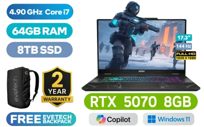 MSI CYBORG 17 B13WGKG Intel Core i7-13620H up to 4.90GHz Processor, 24MB Cache, 10x Cores, 16x Threads / 64GB DDR5 RAM / 8TB Ultra-Fast NVMe SSD / 17.3" FHD (1920 x 1080) 144Hz IPS-Level Display / NVIDIA GeForce RTX 5070 GDDR7 8GB Graphics / Windows 11 Home / Intel Wi-Fi 6E Wireless LAN / Bluetooth 5.3 / 720p HD Camera with Webcam Shutter / 2x Type-A USB / 1x Type-C (Supports DisplayPort / Power Delivery 3.0) / 1x HDMI 2.1 / 1x RJ-45 Ethernet LAN / Kensington Lock / 4-Zone RGB Gaming Keyboard / 2-Year Warranty / MSI Cyborg 17 B13WGKG Intel Core i7 RTX 5070 Gaming LaptopMSI CYBORG 17 B13WGKG Intel Core i7-13620H up to 4.90GHz Processor, 24MB Cache, 10x Cores, 16x Threads / 64GB DDR5 RAM / 8TB Ultra-Fast NVMe SSD / 17.3" FHD (1920 x 1080) 144Hz IPS-Level Display / NVIDIA GeForce RTX 5070 GDDR7 8GB Graphics / Windows 11 Home / Intel Wi-Fi 6E Wireless LAN / Bluetooth 5.3 / 720p HD Camera with Webcam Shutter / 2x Type-A USB / 1x Type-C (Supports DisplayPort / Power Delivery 3.0) / 1x HDMI 2.1 / 1x RJ-45 Ethernet LAN / Kensington Lock / 4-Zone RGB Gaming Keyboard / 2-Year Warranty / MSI Cyborg 17 B13WGKG Intel Core i7 RTX 5070 Gaming Laptop [Cyborg-17-B13WGKG-089ZA/64GB/8TB] / [+] GET FREE EVETECH NEO Premium Gaming Backpack / [+]Get Resident Evil Requiem with select GeForce RTX 50 Series (Standard Edition)+ FREE DELIVERY !