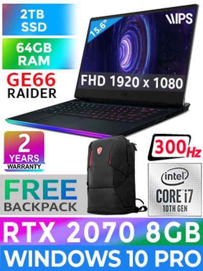 MSI GE66 Raider 10SF 10th Generation Intel Core i7-10750H up to 5.00GHz Processor 12MB Cache, 6x Cores, 12x Threads / 64GB DDR4 RAM / 2TB Ultra-Fast NVMe SSD / 15.6" Full HD (1920 x 1080) Anti-Glare 300Hz IPS-Level Display / NVIDIA 20 Series GeForce RTX 2070 8GB GDDR6 Graphics With Desktop Level Performance / <span style="font-size: 18px; color: red;">Windows 10 Professional (64bit)</span> / Killer Wi-fi 6 ax1650i Wireless LAN / Bluetooth v5.1 / Killer Gb LAN / FHD Web Camera (30fps@1080p) / Steelseries Per Key <span style="font-size: 20px; color: rgb(255, 0, 0);">R</span><span style="font-size: 20px; color: rgb(51, 153, 0);">G</span><span style="font-size: 20px; color: rgb(51, 102, 255);">B</span></span> Backlit Gaming Keyboard / 3 x USB 3.2 Type-A / 2 x USB 3.2 Type-C / 1x Mini-DisplayPort / 1 x HDMI (4K @ 60Hz) / 1 x Microphone & Headphone Combo Jack / 1 x Multi-format SD (XC/HC) Card Reader / Audio By DYNAUDIO / 2x 2W Speakers / Cooler Boosts 5 Cooling System / FREE MSI Gaming Backpack / <span style="color:blue; font-size:18px;">2 Year Warranty</span> / MSI GE66 Raider 10SF Core i7 RTX 2070 Gaming LaptopMSI GE66 Raider 10SF 10th Generation Intel Core i7-10750H up to 5.00GHz Processor 12MB Cache, 6x Cores, 12x Threads / 64GB DDR4 RAM / 2TB Ultra-Fast NVMe SSD / 15.6" Full HD (1920 x 1080) Anti-Glare 300Hz IPS-Level Display / NVIDIA 20 Series GeForce RTX 2070 8GB GDDR6 Graphics With Desktop Level Performance / Windows 10 Professional (64bit) / Killer Wi-fi 6 ax1650i Wireless LAN / Bluetooth v5.1 / Killer Gb LAN / FHD Web Camera (30fps@1080p) / Steelseries Per Key RGB Backlit Gaming Keyboard / 3 x USB 3.2 Type-A / 2 x USB 3.2 Type-C / 1x Mini-DisplayPort / 1 x HDMI (4K @ 60Hz) / 1 x Microphone & Headphone Combo Jack / 1 x Multi-format SD (XC/HC) Card Reader / Audio By DYNAUDIO / 2x 2W Speakers / Cooler Boosts 5 Cooling System / FREE MSI Gaming Backpack / 2 Year Warranty / MSI GE66 Raider 10SF Core i7 RTX 2070 Gaming Laptop [MS-GE66-RAIDER-10SF-240ZA/64GB/2TB] + FREE DELIVERY !