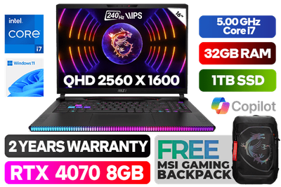 MSI GE68 Raider GE68HX 13th Gen Intel Core i7-13700HX up to 5.00GHz Processor, 30MB Cache, 16x Cores, 24x Threads / 32GB DDR5 RAM / 1TB Ultra-Fast NVMe SSD / 16" QHD+ (2560x1600) Anti-Glare 240Hz Refresh-rate With IPS-Level Display / NVIDIA 40 Series GeForce RTX 4070 8GB GDDR6 Graphics / Windows 11 Home (64bit) / Killer ax Wi-Fi 6E Wireless LAN / Bluetooth v5.3 / Killer Gb LAN / FHD (30fps@1080p) Web Camera / Steelseries Per Key RGB Backlit Gaming Keyboard / 2 x Type-A USB 3.2 / 3 x USB Type-C / 1 x HDMI 2.1 / 1 x Headphone and Microphone Combo Jack / 1 x SD Card Reader / Virtual Surround Sound Powered by Nahimic 3 / 4x 2W Speaker / Advance Cooler Boosts 5 Cooling System / 2 Years Warranty / FREE MSI Gaming Backpack / MSI GE68HX Raider 13VG Core i7 RTX 4070 Gaming Laptop DealMSI GE68 Raider GE68HX 13th Gen Intel Core i7-13700HX up to 5.00GHz Processor, 30MB Cache, 16x Cores, 24x Threads / 32GB DDR5 RAM / 1TB Ultra-Fast NVMe SSD / 16" QHD+ (2560x1600) Anti-Glare 240Hz Refresh-rate With IPS-Level Display / NVIDIA 40 Series GeForce RTX 4070 8GB GDDR6 Graphics / Windows 11 Home (64bit) / Killer ax Wi-Fi 6E Wireless LAN / Bluetooth v5.3 / Killer Gb LAN / FHD (30fps@1080p) Web Camera / Steelseries Per Key RGB Backlit Gaming Keyboard / 2 x Type-A USB 3.2 / 3 x USB Type-C / 1 x HDMI 2.1 / 1 x Headphone and Microphone Combo Jack / 1 x SD Card Reader / Virtual Surround Sound Powered by Nahimic 3 / 4x 2W Speaker / Advance Cooler Boosts 5 Cooling System / 2 Years Warranty / FREE MSI Gaming Backpack / MSI GE68HX Raider 13VG Core i7 RTX 4070 Gaming Laptop Deal [MSI-RAIDER-GE68HX-13VG-098ZA] / [+] GET FREE Monster Clarity 102 AirLinks Wireless In-Ear Headphones+ FREE DELIVERY !