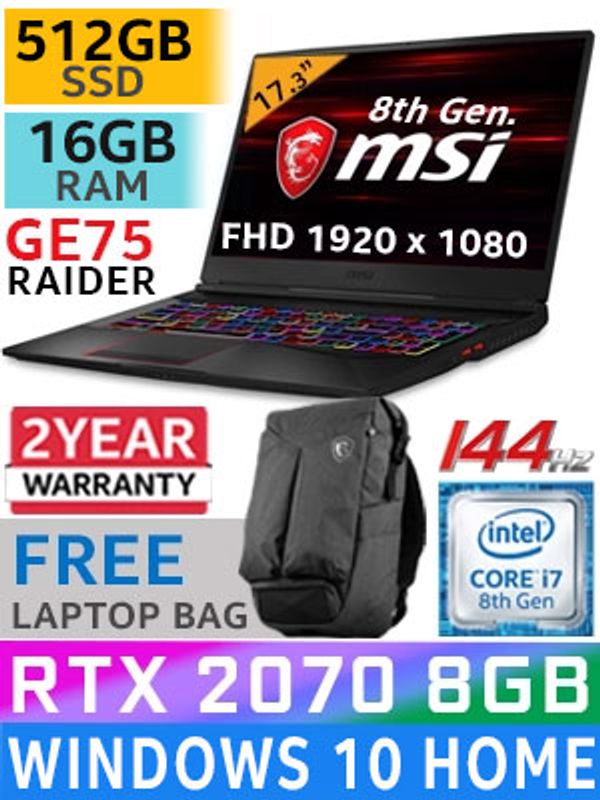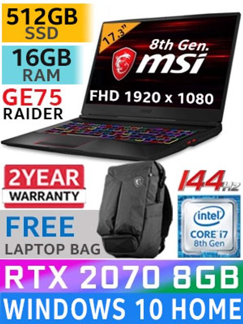 MSI GE75 Raider 8SF 8th Generation Intel Core i7-8750H up to 4.10GHz Processor 9MB Cache, 6x Cores, 12x Threads / 16GB DDR4 RAM / 512GB Ultra-Fast SSD + 1TB 7200rpm HDD / 17.3" Full HD (1920 x 1080) Anti-Glare 144Hz Wideview 94%NTSC Color 3ms Refresh Rate Display / NVIDIA 20 Series GeForce RTX 2070 8GB GDDR6 Graphics With Desktop Level Performance / Windows 10 Home (64bit) / 802.11ac Wireless LAN / Killer Gb LAN / Bluetooth v5.0 / HD (30fps@720p) Web Camera / Steelseries Per Key <span style="font-size: 20px; color: rgb(255, 0, 0);">R</span><span style="font-size: 20px; color: rgb(51, 153, 0);">G</span><span style="font-size: 20px; color: rgb(51, 102, 255);">B</span></span> Backlit Gaming Keyboard / 3 x USB 3.1 Type-A / 1 x USB 3.1 Type-C / 1 x HDMI (4K @ 60Hz) / 1 x Mini DisplayPort / 1 x Microphone jack; 1 x Headphone jack (HiFi / SPDIF) / 1 x Multi-format SD (XC/HC) Card Reader / Audio By DYNAUDIO / 2x 3W GIANT Speakers / Advance Cooler Boosts 5 Cooling System / <span style="color:blue; font-size:18px;">2 Years Fetch And Repair MSI Warranty</span> / FREE MSI Gaming Backpack / MSI GE75 8th Gen Core i7 RTX 2070 Pro Gaming LaptopMSI GE75 Raider 8SF 8th Generation Intel Core i7-8750H up to 4.10GHz Processor 9MB Cache, 6x Cores, 12x Threads / 16GB DDR4 RAM / 512GB Ultra-Fast SSD + 1TB 7200rpm HDD / 17.3" Full HD (1920 x 1080) Anti-Glare 144Hz Wideview 94%NTSC Color 3ms Refresh Rate Display / NVIDIA 20 Series GeForce RTX 2070 8GB GDDR6 Graphics With Desktop Level Performance / Windows 10 Home (64bit) / 802.11ac Wireless LAN / Killer Gb LAN / Bluetooth v5.0 / HD (30fps@720p) Web Camera / Steelseries Per Key RGB Backlit Gaming Keyboard / 3 x USB 3.1 Type-A / 1 x USB 3.1 Type-C / 1 x HDMI (4K @ 60Hz) / 1 x Mini DisplayPort / 1 x Microphone jack; 1 x Headphone jack (HiFi / SPDIF) / 1 x Multi-format SD (XC/HC) Card Reader / Audio By DYNAUDIO / 2x 3W GIANT Speakers / Advance Cooler Boosts 5 Cooling System / 2 Years Fetch And Repair MSI Warranty / FREE MSI Gaming Backpack / MSI GE75 8th Gen Core i7 RTX 2070 Pro Gaming Laptop [MSI-GE75-8SF-212ZA/512GB] + FREE DELIVERY !