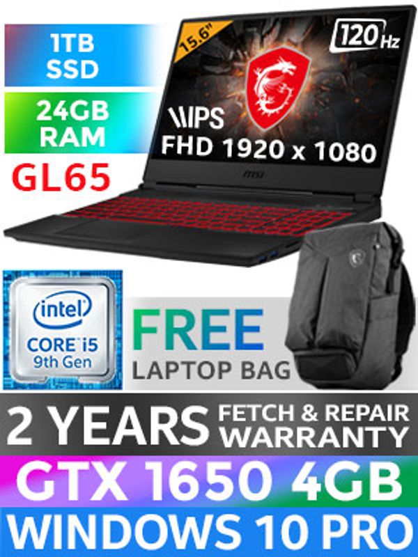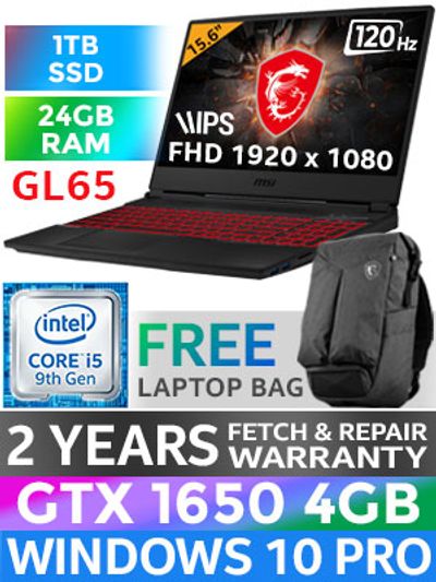 MSI GL65 9SC 9th Gen Intel 9th Gen Intel Core i5-9300H up to 4.1GHz Processor, 8MB Cache, 4x Cores, 8x Threads / 24GB DDR4 RAM / 1TB Ultra-Fast SSD + 1TB Hard Drive / 15.6" FHD 1920x1080 Anti-Glare 120Hz Refresh Rate With IPS-Level Thin-Bezel Display / NVIDIA GeForce GTX 1650 4GB GDDR5 DirectX 12 Dedicated Graphics Card / <span style="color:red; font-size: 17px;">Windows 10 Professional (64bit)</span> / Steelseries Single RED Color Backlit Gaming Keyboard / HD (30fps@720p) Web Camera / Bluetooth v5 / SD Card Reader / 802.11 ac Wireless LAN / 1x Microphone jack & 1x Headphone jack / 1 x HDMI / 3 x USB 3.2 Type-A / 1 x USB 3.2 Type-C / 1x Mini-DisplayPort / 3D Surround Sound Powered by Nahimic 3 + 2x 2W GIANT Speakers / <span style="font-size: 18px; color: blue;">2 Years Fetch And Repair MSI Warranty</span> / FREE MSI Gaming Backpack / MSI GL65 9SC Core i7 GTX 1650 Pro Gaming LaptopMSI GL65 9SC 9th Gen Intel 9th Gen Intel Core i5-9300H up to 4.1GHz Processor, 8MB Cache, 4x Cores, 8x Threads / 24GB DDR4 RAM / 1TB Ultra-Fast SSD + 1TB Hard Drive / 15.6" FHD 1920x1080 Anti-Glare 120Hz Refresh Rate With IPS-Level Thin-Bezel Display / NVIDIA GeForce GTX 1650 4GB GDDR5 DirectX 12 Dedicated Graphics Card / Windows 10 Professional (64bit) / Steelseries Single RED Color Backlit Gaming Keyboard / HD (30fps@720p) Web Camera / Bluetooth v5 / SD Card Reader / 802.11 ac Wireless LAN / 1x Microphone jack & 1x Headphone jack / 1 x HDMI / 3 x USB 3.2 Type-A / 1 x USB 3.2 Type-C / 1x Mini-DisplayPort / 3D Surround Sound Powered by Nahimic 3 + 2x 2W GIANT Speakers / 2 Years Fetch And Repair MSI Warranty / FREE MSI Gaming Backpack / MSI GL65 9SC Core i7 GTX 1650 Pro Gaming Laptop [MSI-GL65-9SC-031ZA/24GB/1TB] + FREE DELIVERY !