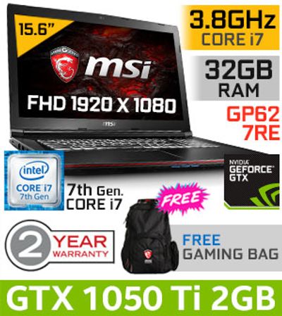 MSI GP62 7RE Leopard Pro Intel 7th Generation Kabylake i7-7700HQ up to 3.80GHz CPU / 32GB DDR4 RAM / 1TB Hard Drive / 15.6” 1920x1080 Full HD Anti-glare Screen / GeForce GTX 1050 Ti GDDR5 2GB Dedicated Graphics With Desktop Level Performance / 720p HD Webcam / Bluetooth v4.2 / 802.11 ac Wireless LAN / Killer Gb LAN / Card Reader SD (XC/HC) / Windows 10 Home 64bit / Steelseries White Backlit Keyboard / DVD Super Multi / Nahimic Sound Technology / Matrix Display Supporting 4K Output up to 2 External Monitors / USB 3.0 Type-C / FREE MSI Gaming Bag / 2 Years Local Warranty / GTX 1050 Ti Gaming Laptop