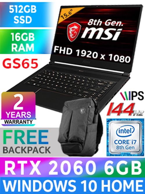 MSI GS65 Stealth Thin 8SE 8th Gen Intel Core i7-8750H up to 4.1GHz Processor, 9MB Cache, 6x Cores, 12x Threads / 16GB DDR4 RAM / 512GB Ultra-Fast NVME PCI-E SSD / 15.6" FHD 1920x1080 144Hz 7ms Refresh Rate With IPS-Level Narrow Bezel Display / NVIDIA 20 Series GeForce RTX 2060 6GB GDDR6 Graphics With Desktop Level Performance / <span style="font-size: 18px; color: red;">Windows 10 Professional</span> / Steelseries Per Key <span style="font-size: 20px; color: rgb(255, 0, 0);">R</span><span style="font-size: 20px; color: rgb(51, 153, 0);">G</span><span style="font-size: 20px; color: rgb(51, 102, 255);">B</span></span> Backlit Gaming Keyboard / 720p HD Webcam / Bluetooth v5 / SD (XC/HC) Card Reader / 802.11ac Wireless LAN / 1 x HDMI 2.0 / 1 x Mini Displayport / 3 x USB 3.1 Type-A / 1 x USB 3.1 Type-C Thunderbolt / Virtual Surround Sound Powered by Nahimic 3 + 2x 2W DYNAUDIO Speakers / Ultra-Thin Bezel Design + Ultra-Light 1.8KG / <span style="font-size: 18px; color: blue;">2 Years Fetch And Repair MSI Warranty</span> / FREE MSI Gaming Backpack / MSI GS65 Stealth 8th Gen RTX 2060 Pro Gaming LaptopMSI GS65 Stealth Thin 8SE 8th Gen Intel Core i7-8750H up to 4.1GHz Processor, 9MB Cache, 6x Cores, 12x Threads / 16GB DDR4 RAM / 512GB Ultra-Fast NVME PCI-E SSD / 15.6" FHD 1920x1080 144Hz 7ms Refresh Rate With IPS-Level Narrow Bezel Display / NVIDIA 20 Series GeForce RTX 2060 6GB GDDR6 Graphics With Desktop Level Performance / Windows 10 Professional / Steelseries Per Key RGB Backlit Gaming Keyboard / 720p HD Webcam / Bluetooth v5 / SD (XC/HC) Card Reader / 802.11ac Wireless LAN / 1 x HDMI 2.0 / 1 x Mini Displayport / 3 x USB 3.1 Type-A / 1 x USB 3.1 Type-C Thunderbolt / Virtual Surround Sound Powered by Nahimic 3 + 2x 2W DYNAUDIO Speakers / Ultra-Thin Bezel Design + Ultra-Light 1.8KG / 2 Years Fetch And Repair MSI Warranty / FREE MSI Gaming Backpack / MSI GS65 Stealth 8th Gen RTX 2060 Pro Gaming Laptop [MS-GS65-8SE-009ZA] + FREE DELIVERY !