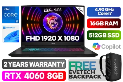 MSI Katana 15 B13VFK 13th Gen Intel Raptor Lake Core i7-13620H up to 4.90GHz Processor, 24MB Cache, 10x Cores, 16x Threads / 16GB DDR5 RAM / 512GB Ultra-Fast NVMe SSD / 15.6" FHD 1920x1080 144Hz IPS Level Display / NVIDIA GeForce RTX 4060 8GB GDDR6 Dedicated Graphics / Windows 11 Home (64bit) / RGB Backlit Gaming Keyboard / HD Web Camera (30fps@720p) / Bluetooth v5.2 / Intel Wi-Fi 6 AX201 Wireless LAN / 2 x USB 3.2 Type-A / 1 x USB 2.0 Type-A / 1 x USB 3.2 Type-C (Displayport) / 1 x HDMI / 1x Mic-in/Headphone-out Combo Jack / Hi-Resolution Audio Boost + 2 x 2W Speaker / 2 Years Warranty / MSI Katana 15 B13VFK Core i7 RTX 4060 Gaming Laptop DealMSI Katana 15 B13VFK 13th Gen Intel Raptor Lake Core i7-13620H up to 4.90GHz Processor, 24MB Cache, 10x Cores, 16x Threads / 16GB DDR5 RAM / 512GB Ultra-Fast NVMe SSD / 15.6" FHD 1920x1080 144Hz IPS Level Display / NVIDIA GeForce RTX 4060 8GB GDDR6 Dedicated Graphics / Windows 11 Home (64bit) / RGB Backlit Gaming Keyboard / HD Web Camera (30fps@720p) / Bluetooth v5.2 / Intel Wi-Fi 6 AX201 Wireless LAN / 2 x USB 3.2 Type-A / 1 x USB 2.0 Type-A / 1 x USB 3.2 Type-C (Displayport) / 1 x HDMI / 1x Mic-in/Headphone-out Combo Jack / Hi-Resolution Audio Boost + 2 x 2W Speaker / 2 Years Warranty / MSI Katana 15 B13VFK Core i7 RTX 4060 Gaming Laptop Deal [MSI-KATANA-15-B13VFK-422ZA] / [+] GET FREE EVETECH NEO Premium Gaming Backpack+ FREE DELIVERY !