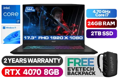 MSI Katana 17 B12VGK 12th Gen Intel Core i7-12650H up to 4.70GHz Processor, 24MB Cache, 10x Cores, 16x Threads / 24GB DDR5 RAM / 2TB Ultra-Fast NVMe SSD / 17.3" FHD 1920x1080 144Hz IPS Level Display / NVIDIA 40 Series GeForce RTX 4070 8GB GDDR6 Dedicated Graphics / Windows 11 Home (64bit) / RGB Backlit Gaming Keyboard / HD Web Camera (30fps@720p) / Intel Wi-Fi 6 Wireless LAN / Bluetooth v5.2 / 3x USB Type-A / 1 x USB Type-C / 1 x HDMI / 1x RJ 45 / 1x Mic-in/Headphone-out Combo Jack / 2 x 2W Speaker / 2 Years Warranty / MSI Katana 17 B12VGK Intel Core i7 RTX 4070 Gaming Laptop DealMSI Katana 17 B12VGK 12th Gen Intel Core i7-12650H up to 4.70GHz Processor, 24MB Cache, 10x Cores, 16x Threads / 24GB DDR5 RAM / 2TB Ultra-Fast NVMe SSD / 17.3" FHD 1920x1080 144Hz IPS Level Display / NVIDIA 40 Series GeForce RTX 4070 8GB GDDR6 Dedicated Graphics / Windows 11 Home (64bit) / RGB Backlit Gaming Keyboard / HD Web Camera (30fps@720p) / Intel Wi-Fi 6 Wireless LAN / Bluetooth v5.2 / 3x USB Type-A / 1 x USB Type-C / 1 x HDMI / 1x RJ 45 / 1x Mic-in/Headphone-out Combo Jack / 2 x 2W Speaker / 2 Years Warranty / MSI Katana 17 B12VGK Intel Core i7 RTX 4070 Gaming Laptop Deal [KATANA-17-B12VGK-837ZA/24GB/2TB] / [+] GET FREE EVETECH NEO Premium Gaming Backpack+ FREE DELIVERY !