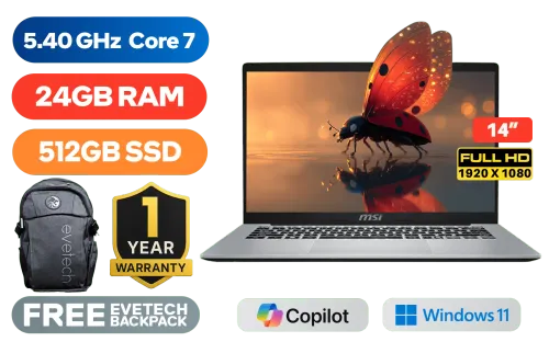 MSI Modern 14 F1MG-438ZA Intel® Core™ 7-150U up to 5.40GHz Processor, 12MB Cache, 10x Cores, 12x Threads / 24GB DDR4 RAM / 512GB Ultra-Fast NVMe SSD / 14" FHD (1920 x 1080) Anti-Glare IPS-Level Display / Integrated Intel® Graphics / Windows 11 Home (64bit) / Intel WiFi 6E AX211 Wireless LAN / Bluetooth 5.3 / 720P HD Web Camera / White Backlit Keyboard / 1x Headphone and Microphone Combo Jack / 3x USB Type-A / 1x USB Type-C / 1 x HDMI / 1x RJ-45 Ethernet LAN / 1x MicroSD Card Reader / Kensington Lock / 1 Year Warranty / MSI Modern 14 F1MG-438ZA Intel Core 7 Professional LaptopMSI Modern 14 F1MG-438ZA Intel® Core™ 7-150U up to 5.40GHz Processor, 12MB Cache, 10x Cores, 12x Threads / 24GB DDR4 RAM / 512GB Ultra-Fast NVMe SSD / 14" FHD (1920 x 1080) Anti-Glare IPS-Level Display / Integrated Intel® Graphics / Windows 11 Home (64bit) / Intel WiFi 6E AX211 Wireless LAN / Bluetooth 5.3 / 720P HD Web Camera / White Backlit Keyboard / 1x Headphone and Microphone Combo Jack / 3x USB Type-A / 1x USB Type-C / 1 x HDMI / 1x RJ-45 Ethernet LAN / 1x MicroSD Card Reader / Kensington Lock / 1 Year Warranty / MSI Modern 14 F1MG-438ZA Intel Core 7 Professional Laptop [MODERN-14-F1MG-438ZA/24GB] / [+] GET FREE Promate Samit Wireless Mouse / [+] GET FREE EVETECH FLUX Premium Gaming Backpack+ FREE DELIVERY !