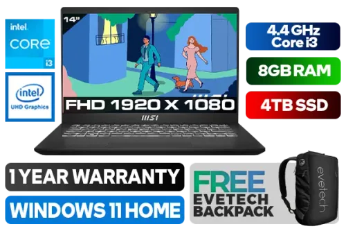 MSI Modern 14 C12MO 12th Gen Intel Core i3-1215U up to 4.4GHz Processor, 10MB Cache, 6x Cores, 8x Threads / 8GB DDR4 RAM / 4TB Ultra-Fast NVMe SSD / 14" Full HD (1920 x 1080) Anti-Glare IPS-Level Display / Intel UHD Integrated Graphics / Windows 11 Home (64bit) / Intel Wi-Fi 6 Wireless LAN / Bluetooth 5.2 / Single White Color Backlit Keyboard / HD (30fps@720p) Web Camera / 3x USB Type-A / 1x USB 3.2 Type-C / 1 x HDMI / 1x Headphone & Microphone Combo Jack / 1x MicroSD Card Reader / 2x 2W Speaker / 1 Years Warranty / MSI Modern 14 Core i3 Professional LaptopMSI Modern 14 C12MO 12th Gen Intel Core i3-1215U up to 4.4GHz Processor, 10MB Cache, 6x Cores, 8x Threads / 8GB DDR4 RAM / 4TB Ultra-Fast NVMe SSD / 14" Full HD (1920 x 1080) Anti-Glare IPS-Level Display / Intel UHD Integrated Graphics / Windows 11 Home (64bit) / Intel Wi-Fi 6 Wireless LAN / Bluetooth 5.2 / Single White Color Backlit Keyboard / HD (30fps@720p) Web Camera / 3x USB Type-A / 1x USB 3.2 Type-C / 1 x HDMI / 1x Headphone & Microphone Combo Jack / 1x MicroSD Card Reader / 2x 2W Speaker / 1 Years Warranty / MSI Modern 14 Core i3 Professional Laptop [MODERN-14-C12MO-1081ZA/4TB] / [+] GET FREE EVETECH NEO Premium Gaming Backpack+ FREE DELIVERY !