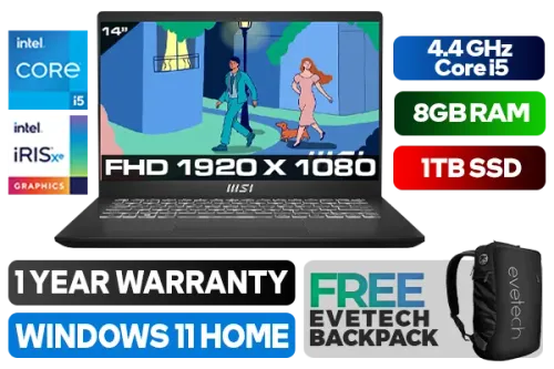 MSI Modern 14 C12MO 12th Gen Intel Core i5-1235U up to 4.4GHz Processor, 12MB Cache, 10x Cores, 12x Threads / 8GB DDR4 RAM / 1TB Ultra-Fast NVMe SSD / 14" Full HD (1920 x 1080) Anti-Glare IPS-Level Display / Intel Iris Xe Integrated Graphics / Windows 11 Home (64bit) / Intel Wi-Fi 6 Wireless LAN / Bluetooth 5.2 / Single White Color Backlit Keyboard / HD (30fps@720p) Web Camera / 3x USB Type-A / 1x USB 3.2 Type-C / 1 x HDMI / 1x Headphone & Microphone Combo Jack / 1x MicroSD Card Reader / 2x 2W Speaker / 1 Years Warranty / MSI Modern 14 Core i5 Professional LaptopMSI Modern 14 C12MO 12th Gen Intel Core i5-1235U up to 4.4GHz Processor, 12MB Cache, 10x Cores, 12x Threads / 8GB DDR4 RAM / 1TB Ultra-Fast NVMe SSD / 14" Full HD (1920 x 1080) Anti-Glare IPS-Level Display / Intel Iris Xe Integrated Graphics / Windows 11 Home (64bit) / Intel Wi-Fi 6 Wireless LAN / Bluetooth 5.2 / Single White Color Backlit Keyboard / HD (30fps@720p) Web Camera / 3x USB Type-A / 1x USB 3.2 Type-C / 1 x HDMI / 1x Headphone & Microphone Combo Jack / 1x MicroSD Card Reader / 2x 2W Speaker / 1 Years Warranty / MSI Modern 14 Core i5 Professional Laptop [MODERN-14-C12MO-1082ZA/1TB] / [+] GET FREE EVETECH NEO Premium Gaming Backpack+ FREE DELIVERY !