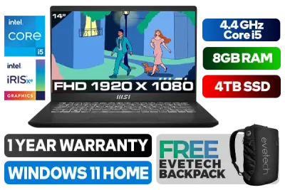 MSI Modern 14 C12MO 12th Gen Intel Core i5-1235U up to 4.4GHz Processor, 12MB Cache, 10x Cores, 12x Threads / 8GB DDR4 RAM / 4TB Ultra-Fast NVMe SSD / 14" Full HD (1920 x 1080) Anti-Glare IPS-Level Display / Intel Iris Xe Integrated Graphics / Windows 11 Home (64bit) / Intel Wi-Fi 6 Wireless LAN / Bluetooth 5.2 / Single White Color Backlit Keyboard / HD (30fps@720p) Web Camera / 3x USB Type-A / 1x USB 3.2 Type-C / 1 x HDMI / 1x Headphone & Microphone Combo Jack / 1x MicroSD Card Reader / 2x 2W Speaker / 1 Years Warranty / MSI Modern 14 Core i5 Professional LaptopMSI Modern 14 C12MO 12th Gen Intel Core i5-1235U up to 4.4GHz Processor, 12MB Cache, 10x Cores, 12x Threads / 8GB DDR4 RAM / 4TB Ultra-Fast NVMe SSD / 14" Full HD (1920 x 1080) Anti-Glare IPS-Level Display / Intel Iris Xe Integrated Graphics / Windows 11 Home (64bit) / Intel Wi-Fi 6 Wireless LAN / Bluetooth 5.2 / Single White Color Backlit Keyboard / HD (30fps@720p) Web Camera / 3x USB Type-A / 1x USB 3.2 Type-C / 1 x HDMI / 1x Headphone & Microphone Combo Jack / 1x MicroSD Card Reader / 2x 2W Speaker / 1 Years Warranty / MSI Modern 14 Core i5 Professional Laptop [MODERN-14-C12MO-1082ZA/4TB] / [+] GET FREE EVETECH NEO Premium Gaming Backpack+ FREE DELIVERY !