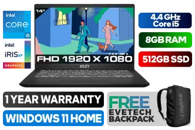 MSI Modern 14 C12MO 12th Gen Intel Core i5-1235U up to 4.4GHz Processor, 12MB Cache, 10x Cores, 12x Threads / 8GB DDR4 RAM / 512GB Ultra-Fast NVMe SSD / 14" Full HD (1920 x 1080) Anti-Glare IPS-Level Display / Intel Iris Xe Integrated Graphics / Windows 11 Home (64bit) / Intel Wi-Fi 6 Wireless LAN / Bluetooth 5.2 / Single White Color Backlit Keyboard / HD (30fps@720p) Web Camera / 3x USB Type-A / 1x USB 3.2 Type-C / 1 x HDMI / 1x Headphone & Microphone Combo Jack / 1x MicroSD Card Reader / 2x 2W Speaker / 1 Years Warranty / MSI Modern 14 Core i5 Professional LaptopMSI Modern 14 C12MO 12th Gen Intel Core i5-1235U up to 4.4GHz Processor, 12MB Cache, 10x Cores, 12x Threads / 8GB DDR4 RAM / 512GB Ultra-Fast NVMe SSD / 14" Full HD (1920 x 1080) Anti-Glare IPS-Level Display / Intel Iris Xe Integrated Graphics / Windows 11 Home (64bit) / Intel Wi-Fi 6 Wireless LAN / Bluetooth 5.2 / Single White Color Backlit Keyboard / HD (30fps@720p) Web Camera / 3x USB Type-A / 1x USB 3.2 Type-C / 1 x HDMI / 1x Headphone & Microphone Combo Jack / 1x MicroSD Card Reader / 2x 2W Speaker / 1 Years Warranty / MSI Modern 14 Core i5 Professional Laptop [MODERN-14-C12MO-1082ZA] / [+] GET FREE EVETECH NEO Premium Gaming Backpack+ FREE DELIVERY !