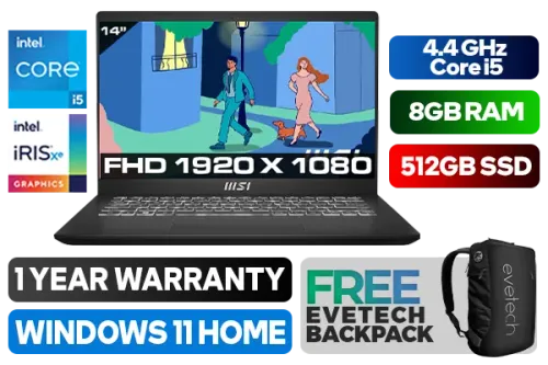 MSI Modern 14 C12MO 12th Gen Intel Core i5-1235U up to 4.4GHz Processor, 12MB Cache, 10x Cores, 12x Threads / 8GB DDR4 RAM / 512GB Ultra-Fast NVMe SSD / 14" Full HD (1920 x 1080) Anti-Glare IPS-Level Display / Intel Iris Xe Integrated Graphics / Windows 11 Home (64bit) / Intel Wi-Fi 6 Wireless LAN / Bluetooth 5.2 / Single White Color Backlit Keyboard / HD (30fps@720p) Web Camera / 3x USB Type-A / 1x USB 3.2 Type-C / 1 x HDMI / 1x Headphone & Microphone Combo Jack / 1x MicroSD Card Reader / 2x 2W Speaker / 1 Years Warranty / MSI Modern 14 Core i5 Professional LaptopMSI Modern 14 C12MO 12th Gen Intel Core i5-1235U up to 4.4GHz Processor, 12MB Cache, 10x Cores, 12x Threads / 8GB DDR4 RAM / 512GB Ultra-Fast NVMe SSD / 14" Full HD (1920 x 1080) Anti-Glare IPS-Level Display / Intel Iris Xe Integrated Graphics / Windows 11 Home (64bit) / Intel Wi-Fi 6 Wireless LAN / Bluetooth 5.2 / Single White Color Backlit Keyboard / HD (30fps@720p) Web Camera / 3x USB Type-A / 1x USB 3.2 Type-C / 1 x HDMI / 1x Headphone & Microphone Combo Jack / 1x MicroSD Card Reader / 2x 2W Speaker / 1 Years Warranty / MSI Modern 14 Core i5 Professional Laptop [MODERN-14-C12MO-1082ZA] / [+] GET FREE EVETECH NEO Premium Gaming Backpack+ FREE DELIVERY !