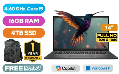 MSI Modern 14 F13MG-437ZA 13th Gen Intel® Core™ i5-1334U up to 4.60GHz Processor, 12MB Cache, 10x Cores, 12x Threads / 16GB DDR4 RAM / 4TB Ultra-Fast NVMe SSD / 14" FHD (1920 x 1080) Anti-Glare IPS-Level Display / Integrated Intel® Iris® Xe graphics / Windows 11 Home (64bit) / White Backlit Keyboard / 720P HD Web Camera / Intel® Wi-Fi® 6E AX211 Wireless LAN / Bluetooth 5.3 / 1x Headphone and Microphone Combo Jack / 3x USB Type-A / 1x USB Type-C / 1 x HDMI / 1x RJ-45 / 1x MicroSD Card Reader / 1 Year Warranty / MSI Modern 14 F13MG-437ZA 13th Gen Intel Core i5 Professional LaptopMSI Modern 14 F13MG-437ZA 13th Gen Intel® Core™ i5-1334U up to 4.60GHz Processor, 12MB Cache, 10x Cores, 12x Threads / 16GB DDR4 RAM / 4TB Ultra-Fast NVMe SSD / 14" FHD (1920 x 1080) Anti-Glare IPS-Level Display / Integrated Intel® Iris® Xe graphics / Windows 11 Home (64bit) / White Backlit Keyboard / 720P HD Web Camera / Intel® Wi-Fi® 6E AX211 Wireless LAN / Bluetooth 5.3 / 1x Headphone and Microphone Combo Jack / 3x USB Type-A / 1x USB Type-C / 1 x HDMI / 1x RJ-45 / 1x MicroSD Card Reader / 1 Year Warranty / MSI Modern 14 F13MG-437ZA 13th Gen Intel Core i5 Professional Laptop [MODERN-14-F13MG-437ZA/4TB] / [+] GET FREE EVETECH DASH Premium Gaming Backpack+ FREE DELIVERY !