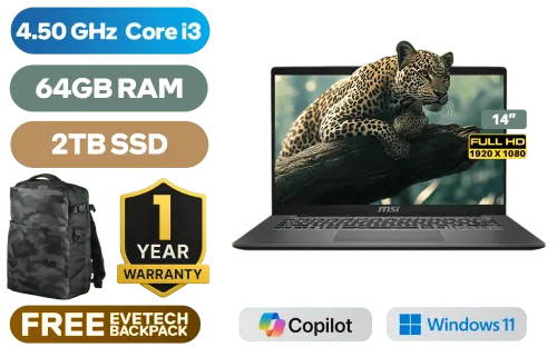 MSI Modern 14 F13MG-632ZA Raptor Lake Intel Core i3-1315U up to 4.50GHz Processor, 10MB Cache, 6x Cores, 8x Threads / 64GB DDR4 RAM / 2TB Ultra-Fast NVMe SSD / Integrated Intel UHD Graphics / 14" FHD (1920 x 1080) IPS-Level Display / Windows 11 Home / Intel Wi-Fi 6E Wireless LAN / Bluetooth 5.3 / 720p HD Web Camera with Privacy Shutter / 3x USB Type-A / 1x USB Type-C (Supports DisplayPort / Power Delivery 3.0) / 1x HDMI / 1x RJ-45 / 1x Microphone & Headphone Combo Jack / 1x Micro SD Card Reader / Kensington Lock / Single White Backlit Keyboard / 2x 2W Speakers / 1-Year Warranty / MSI Modern 14 F13MG-632ZA Intel Core i3 Laptop DealMSI Modern 14 F13MG-632ZA Raptor Lake Intel Core i3-1315U up to 4.50GHz Processor, 10MB Cache, 6x Cores, 8x Threads / 64GB DDR4 RAM / 2TB Ultra-Fast NVMe SSD / Integrated Intel UHD Graphics / 14" FHD (1920 x 1080) IPS-Level Display / Windows 11 Home / Intel Wi-Fi 6E Wireless LAN / Bluetooth 5.3 / 720p HD Web Camera with Privacy Shutter / 3x USB Type-A / 1x USB Type-C (Supports DisplayPort / Power Delivery 3.0) / 1x HDMI / 1x RJ-45 / 1x Microphone & Headphone Combo Jack / 1x Micro SD Card Reader / Kensington Lock / Single White Backlit Keyboard / 2x 2W Speakers / 1-Year Warranty / MSI Modern 14 F13MG-632ZA Intel Core i3 Laptop Deal [Modern-14-F13MG-632ZA/64GB/2TB] / [+] GET FREE EVETECH DASH Premium Gaming Backpack+ FREE DELIVERY !