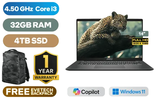 MSI Modern 14 F13MG-632ZA Raptor Lake Intel Core i3-1315U up to 4.50GHz Processor, 10MB Cache, 6x Cores, 8x Threads / 32GB DDR4 RAM / 4TB Ultra-Fast NVMe SSD / Integrated Intel UHD Graphics / 14" FHD (1920 x 1080) IPS-Level Display / Windows 11 Home / Intel Wi-Fi 6E Wireless LAN / Bluetooth 5.3 / 720p HD Web Camera with Privacy Shutter / 3x USB Type-A / 1x USB Type-C (Supports DisplayPort / Power Delivery 3.0) / 1x HDMI / 1x RJ-45 / 1x Microphone & Headphone Combo Jack / 1x Micro SD Card Reader / Kensington Lock / Single White Backlit Keyboard / 2x 2W Speakers / 1-Year Warranty / MSI Modern 14 F13MG-632ZA Intel Core i3 Laptop DealMSI Modern 14 F13MG-632ZA Raptor Lake Intel Core i3-1315U up to 4.50GHz Processor, 10MB Cache, 6x Cores, 8x Threads / 32GB DDR4 RAM / 4TB Ultra-Fast NVMe SSD / Integrated Intel UHD Graphics / 14" FHD (1920 x 1080) IPS-Level Display / Windows 11 Home / Intel Wi-Fi 6E Wireless LAN / Bluetooth 5.3 / 720p HD Web Camera with Privacy Shutter / 3x USB Type-A / 1x USB Type-C (Supports DisplayPort / Power Delivery 3.0) / 1x HDMI / 1x RJ-45 / 1x Microphone & Headphone Combo Jack / 1x Micro SD Card Reader / Kensington Lock / Single White Backlit Keyboard / 2x 2W Speakers / 1-Year Warranty / MSI Modern 14 F13MG-632ZA Intel Core i3 Laptop Deal [Modern-14-F13MG-632ZA/32GB/4TB] / [+] GET FREE EVETECH DASH Premium Gaming Backpack+ FREE DELIVERY !