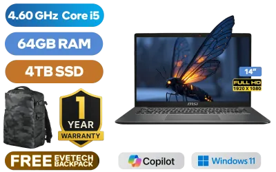 MSI Modern 14 F13MG 13th Gen Intel® Core™ i5-1334U up to 4.60GHz Processor, 12MB Cache, 10x Cores, 12x Threads / 64GB DDR4 RAM / 4TB Ultra-Fast NVMe SSD / 14" FHD (1920 x 1080) Anti-Glare IPS-Level Display / Integrated Intel® UHD graphics / Windows 11 Home (64bit) / Intel WiFi 6E AX211 Wireless LAN / Bluetooth 5.3 / 720p HD Web Camera with Privacy Shutter / 3x USB Type-A / 1x USB Type-C (Supports DisplayPort / Power Delivery 3.0) / 1 x HDMI / 1x RJ45 / 1x Headphone & Microphone Combo Jack / 1x MicroSD Card Reader / White Backlit Keyboard / 2x 2W Speakers / 1 Year Warranty / MSI Modern 14 F13MG Intel® Core™ i5 Professional LaptopMSI Modern 14 F13MG 13th Gen Intel® Core™ i5-1334U up to 4.60GHz Processor, 12MB Cache, 10x Cores, 12x Threads / 64GB DDR4 RAM / 4TB Ultra-Fast NVMe SSD / 14" FHD (1920 x 1080) Anti-Glare IPS-Level Display / Integrated Intel® UHD graphics / Windows 11 Home (64bit) / Intel WiFi 6E AX211 Wireless LAN / Bluetooth 5.3 / 720p HD Web Camera with Privacy Shutter / 3x USB Type-A / 1x USB Type-C (Supports DisplayPort / Power Delivery 3.0) / 1 x HDMI / 1x RJ45 / 1x Headphone & Microphone Combo Jack / 1x MicroSD Card Reader / White Backlit Keyboard / 2x 2W Speakers / 1 Year Warranty / MSI Modern 14 F13MG Intel® Core™ i5 Professional Laptop [MODERN-14-F13MG-275ZA/64GB/4TB] / [+] GET FREE EVETECH DASH Premium Gaming Backpack+ FREE DELIVERY !