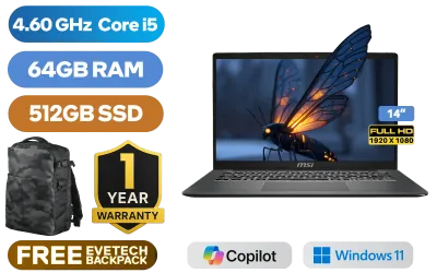 MSI Modern 14 F13MG 13th Gen Intel® Core™ i5-1334U up to 4.60GHz Processor, 12MB Cache, 10x Cores, 12x Threads / 64GB DDR4 RAM / 512GB Ultra-Fast NVMe SSD / 14" FHD (1920 x 1080) Anti-Glare IPS-Level Display / Integrated Intel® UHD graphics / Windows 11 Home (64bit) / Intel WiFi 6E AX211 Wireless LAN / Bluetooth 5.3 / 720p HD Web Camera with Privacy Shutter / 3x USB Type-A / 1x USB Type-C (Supports DisplayPort / Power Delivery 3.0) / 1 x HDMI / 1x RJ45 / 1x Headphone & Microphone Combo Jack / 1x MicroSD Card Reader / White Backlit Keyboard / 2x 2W Speakers / 1 Year Warranty / MSI Modern 14 F13MG Intel® Core™ i5 Professional LaptopMSI Modern 14 F13MG 13th Gen Intel® Core™ i5-1334U up to 4.60GHz Processor, 12MB Cache, 10x Cores, 12x Threads / 64GB DDR4 RAM / 512GB Ultra-Fast NVMe SSD / 14" FHD (1920 x 1080) Anti-Glare IPS-Level Display / Integrated Intel® UHD graphics / Windows 11 Home (64bit) / Intel WiFi 6E AX211 Wireless LAN / Bluetooth 5.3 / 720p HD Web Camera with Privacy Shutter / 3x USB Type-A / 1x USB Type-C (Supports DisplayPort / Power Delivery 3.0) / 1 x HDMI / 1x RJ45 / 1x Headphone & Microphone Combo Jack / 1x MicroSD Card Reader / White Backlit Keyboard / 2x 2W Speakers / 1 Year Warranty / MSI Modern 14 F13MG Intel® Core™ i5 Professional Laptop [MODERN-14-F13MG-275ZA/64GB] / [+] GET FREE EVETECH DASH Premium Gaming Backpack+ FREE DELIVERY !