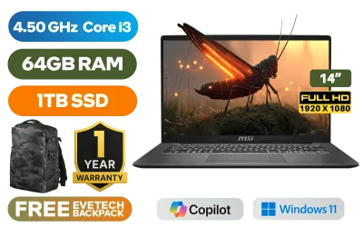 MSI Modern 14 F13MG 13th Gen Intel® Core™ i3-1315U up to 4.50GHz Processor, 10MB Cache, 6x Cores, 8x Threads / 64GB DDR4 RAM / 1TB Ultra-Fast NVMe SSD / 14" FHD (1920 x 1080) IPS-Level Display / Intel UHD Integrated Graphics / Windows 11 Home (64bit) / Intel WiFi 6E AX211 Wireless LAN / Bluetooth 5.3 / Single White Backlit Keyboard / 720p HD Web Camera with Privacy Shutter / 3x USB Type-A / 1x USB 3.2 Type-C / 1 x HDMI / 1x RJ45 Ethernet Port / 1x Headphone & Microphone Combo Jack / 1x MicroSD Card Reader / 2x 2W Speakers / 1 Year Warranty / MSI Modern 14 F13MG Intel® Core™ i3 Professional LaptopMSI Modern 14 F13MG 13th Gen Intel® Core™ i3-1315U up to 4.50GHz Processor, 10MB Cache, 6x Cores, 8x Threads / 64GB DDR4 RAM / 1TB Ultra-Fast NVMe SSD / 14" FHD (1920 x 1080) IPS-Level Display / Intel UHD Integrated Graphics / Windows 11 Home (64bit) / Intel WiFi 6E AX211 Wireless LAN / Bluetooth 5.3 / Single White Backlit Keyboard / 720p HD Web Camera with Privacy Shutter / 3x USB Type-A / 1x USB 3.2 Type-C / 1 x HDMI / 1x RJ45 Ethernet Port / 1x Headphone & Microphone Combo Jack / 1x MicroSD Card Reader / 2x 2W Speakers / 1 Year Warranty / MSI Modern 14 F13MG Intel® Core™ i3 Professional Laptop [MODERN-14-F13MG-039ZA/64GB/1TB] / [+] GET FREE EVETECH DASH Premium Gaming Backpack / [+] GET FREE Promate Clix-8 Wireless Mouse+ FREE DELIVERY !