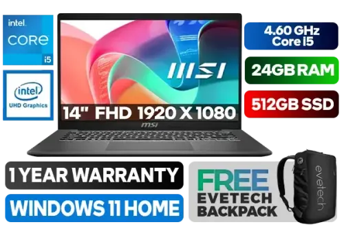 MSI Modern 14 F13MG Intel® Core™i5-1335U up to 4.60GHz Processor, 12MB Cache, 10x Cores, 12x Threads / 24GB DDR4 RAM / 512GB Ultra-Fast NVMe SSD / 14" Full HD (1920 x 1080) IPS-Level Display / Intel UHD Integrated Graphics / Windows 11 Home (64bit) / Intel WiFi 6E AX211 Wireless LAN / Bluetooth 5.3 / Single White Color Backlit Keyboard / HD (30fps@720p) Web Camera / 3x USB Type-A / 1x USB 3.2 Type-C / 1 x HDMI / 1x RJ45 / 1x Headphone & Microphone Combo Jack / 1x MicroSD Card Reader / 2x 2W Speaker / 1 Year Warranty / MSI Modern 14 F13MG Intel® Core™ i5 Professional Laptop DealMSI Modern 14 F13MG Intel® Core™i5-1335U up to 4.60GHz Processor, 12MB Cache, 10x Cores, 12x Threads / 24GB DDR4 RAM / 512GB Ultra-Fast NVMe SSD / 14" Full HD (1920 x 1080) IPS-Level Display / Intel UHD Integrated Graphics / Windows 11 Home (64bit) / Intel WiFi 6E AX211 Wireless LAN / Bluetooth 5.3 / Single White Color Backlit Keyboard / HD (30fps@720p) Web Camera / 3x USB Type-A / 1x USB 3.2 Type-C / 1 x HDMI / 1x RJ45 / 1x Headphone & Microphone Combo Jack / 1x MicroSD Card Reader / 2x 2W Speaker / 1 Year Warranty / MSI Modern 14 F13MG Intel® Core™ i5 Professional Laptop Deal [MODERN-14-F13MG-038ZA/24GB] / [+] GET FREE EVETECH NEO Premium Gaming Backpack+ FREE DELIVERY !