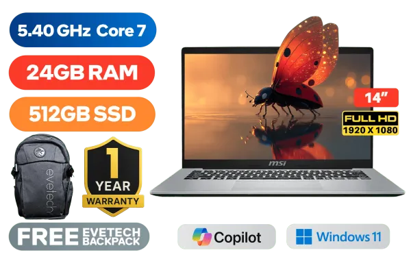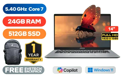 MSI Modern 14 F1MG-438ZA Intel® Core™ 7-150U up to 5.40GHz Processor, 12MB Cache, 10x Cores, 12x Threads / 24GB DDR4 RAM / 512GB Ultra-Fast NVMe SSD / 14" FHD (1920 x 1080) Anti-Glare IPS-Level Display / Integrated Intel® Graphics / Windows 11 Home (64bit) / Intel WiFi 6E AX211 Wireless LAN / Bluetooth 5.3 / 720P HD Web Camera / White Backlit Keyboard / 1x Headphone and Microphone Combo Jack / 3x USB Type-A / 1x USB Type-C / 1 x HDMI / 1x RJ-45 Ethernet LAN / 1x MicroSD Card Reader / Kensington Lock / 1 Year Warranty / MSI Modern 14 F1MG-438ZA Intel Core 7 Professional LaptopMSI Modern 14 F1MG-438ZA Intel® Core™ 7-150U up to 5.40GHz Processor, 12MB Cache, 10x Cores, 12x Threads / 24GB DDR4 RAM / 512GB Ultra-Fast NVMe SSD / 14" FHD (1920 x 1080) Anti-Glare IPS-Level Display / Integrated Intel® Graphics / Windows 11 Home (64bit) / Intel WiFi 6E AX211 Wireless LAN / Bluetooth 5.3 / 720P HD Web Camera / White Backlit Keyboard / 1x Headphone and Microphone Combo Jack / 3x USB Type-A / 1x USB Type-C / 1 x HDMI / 1x RJ-45 Ethernet LAN / 1x MicroSD Card Reader / Kensington Lock / 1 Year Warranty / MSI Modern 14 F1MG-438ZA Intel Core 7 Professional Laptop [MODERN-14-F1MG-438ZA/24GB] / [+] GET FREE Promate Samit Wireless Mouse / [+] GET FREE EVETECH FLUX Premium Gaming Backpack+ FREE DELIVERY !