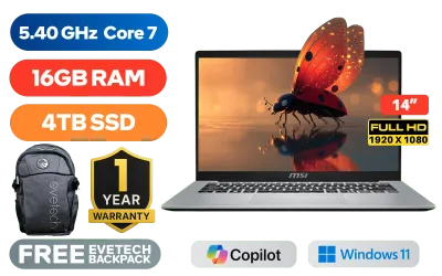 MSI Modern 14 F1MG-438ZA Intel® Core™ 7-150U up to 5.40GHz Processor, 12MB Cache, 10x Cores, 12x Threads / 16GB DDR4 RAM / 4TB Ultra-Fast NVMe SSD / 14" FHD (1920 x 1080) Anti-Glare IPS-Level Display / Integrated Intel® Graphics / Windows 11 Home (64bit) / Intel WiFi 6E AX211 Wireless LAN / Bluetooth 5.3 / 720P HD Web Camera / White Backlit Keyboard / 1x Headphone and Microphone Combo Jack / 3x USB Type-A / 1x USB Type-C / 1 x HDMI / 1x RJ-45 Ethernet LAN / 1x MicroSD Card Reader / Kensington Lock / 1 Year Warranty / MSI Modern 14 F1MG-438ZA Intel Core 7 Professional LaptopMSI Modern 14 F1MG-438ZA Intel® Core™ 7-150U up to 5.40GHz Processor, 12MB Cache, 10x Cores, 12x Threads / 16GB DDR4 RAM / 4TB Ultra-Fast NVMe SSD / 14" FHD (1920 x 1080) Anti-Glare IPS-Level Display / Integrated Intel® Graphics / Windows 11 Home (64bit) / Intel WiFi 6E AX211 Wireless LAN / Bluetooth 5.3 / 720P HD Web Camera / White Backlit Keyboard / 1x Headphone and Microphone Combo Jack / 3x USB Type-A / 1x USB Type-C / 1 x HDMI / 1x RJ-45 Ethernet LAN / 1x MicroSD Card Reader / Kensington Lock / 1 Year Warranty / MSI Modern 14 F1MG-438ZA Intel Core 7 Professional Laptop [MODERN-14-F1MG-438ZA/4TB] / [+] GET FREE Promate Samit Wireless Mouse / [+] GET FREE EVETECH FLUX Premium Gaming Backpack+ FREE DELIVERY !