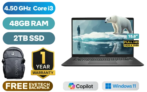 MSI Modern 15 F13MG Intel Core i3-1315U up to 4.50GHz Processor, 10MB Cache, 6x Cores, 8x Threads / 48GB DDR4 RAM / 2TB NVMe PCIe SSD / 15.6" FHD (1920 x 1080) IPS-Level Display / Intel UHD Graphics / Windows 11 Home / Intel Wi-Fi 6E Wireless LAN / Bluetooth 5.3 / 720p HD Camera with Webcam Shutter / 3x USB Type-A / 1x USB Type-C (Supports DisplayPort / Power Delivery 3.0) / 1x HDMI / 1x Microphone & Headphone Combo Jack / 1x RJ-45 Ethernet LAN / 1x Micro SD Card Reader / Kensington Lock / Single White Backlit Keyboard / 2x 2W Speakers / 1-Year Warranty / MSI Modern 15 F13MG-849ZA Intel Core i3 Laptop DealMSI Modern 15 F13MG Intel Core i3-1315U up to 4.50GHz Processor, 10MB Cache, 6x Cores, 8x Threads / 48GB DDR4 RAM / 2TB NVMe PCIe SSD / 15.6" FHD (1920 x 1080) IPS-Level Display / Intel UHD Graphics / Windows 11 Home / Intel Wi-Fi 6E Wireless LAN / Bluetooth 5.3 / 720p HD Camera with Webcam Shutter / 3x USB Type-A / 1x USB Type-C (Supports DisplayPort / Power Delivery 3.0) / 1x HDMI / 1x Microphone & Headphone Combo Jack / 1x RJ-45 Ethernet LAN / 1x Micro SD Card Reader / Kensington Lock / Single White Backlit Keyboard / 2x 2W Speakers / 1-Year Warranty / MSI Modern 15 F13MG-849ZA Intel Core i3 Laptop Deal [Modern-15-F13MG-849ZA/48GB/2TB] / [+] GET FREE EVETECH FLUX Premium Gaming Backpack+ FREE DELIVERY !