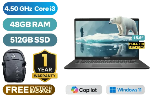 MSI Modern 15 F13MG Intel Core i3-1315U up to 4.50GHz Processor, 10MB Cache, 6x Cores, 8x Threads / 48GB DDR4 RAM / 512GB NVMe PCIe SSD / 15.6" FHD (1920 x 1080) IPS-Level Display / Intel UHD Graphics / Windows 11 Home / Intel Wi-Fi 6E Wireless LAN / Bluetooth 5.3 / 720p HD Camera with Webcam Shutter / 3x USB Type-A / 1x USB Type-C (Supports DisplayPort / Power Delivery 3.0) / 1x HDMI / 1x Microphone & Headphone Combo Jack / 1x RJ-45 Ethernet LAN / 1x Micro SD Card Reader / Kensington Lock / Single White Backlit Keyboard / 2x 2W Speakers / 1-Year Warranty / MSI Modern 15 F13MG-849ZA Intel Core i3 Laptop DealMSI Modern 15 F13MG Intel Core i3-1315U up to 4.50GHz Processor, 10MB Cache, 6x Cores, 8x Threads / 48GB DDR4 RAM / 512GB NVMe PCIe SSD / 15.6" FHD (1920 x 1080) IPS-Level Display / Intel UHD Graphics / Windows 11 Home / Intel Wi-Fi 6E Wireless LAN / Bluetooth 5.3 / 720p HD Camera with Webcam Shutter / 3x USB Type-A / 1x USB Type-C (Supports DisplayPort / Power Delivery 3.0) / 1x HDMI / 1x Microphone & Headphone Combo Jack / 1x RJ-45 Ethernet LAN / 1x Micro SD Card Reader / Kensington Lock / Single White Backlit Keyboard / 2x 2W Speakers / 1-Year Warranty / MSI Modern 15 F13MG-849ZA Intel Core i3 Laptop Deal [Modern-15-F13MG-849ZA/48GB] / [+] GET FREE EVETECH FLUX Premium Gaming Backpack+ FREE DELIVERY !