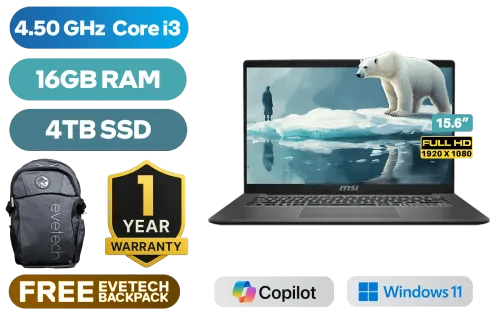 MSI Modern 15 F13MG Intel Core i3-1315U up to 4.50GHz Processor, 10MB Cache, 6x Cores, 8x Threads / 16GB DDR4 RAM / 4TB NVMe PCIe SSD / 15.6" FHD (1920 x 1080) IPS-Level Display / Intel UHD Graphics / Windows 11 Home / Intel Wi-Fi 6E Wireless LAN / Bluetooth 5.3 / 720p HD Camera with Webcam Shutter / 3x USB Type-A / 1x USB Type-C (Supports DisplayPort / Power Delivery 3.0) / 1x HDMI / 1x Microphone & Headphone Combo Jack / 1x RJ-45 Ethernet LAN / 1x Micro SD Card Reader / Kensington Lock / Single White Backlit Keyboard / 2x 2W Speakers / 1-Year Warranty / MSI Modern 15 F13MG-849ZA Intel Core i3 Laptop DealMSI Modern 15 F13MG Intel Core i3-1315U up to 4.50GHz Processor, 10MB Cache, 6x Cores, 8x Threads / 16GB DDR4 RAM / 4TB NVMe PCIe SSD / 15.6" FHD (1920 x 1080) IPS-Level Display / Intel UHD Graphics / Windows 11 Home / Intel Wi-Fi 6E Wireless LAN / Bluetooth 5.3 / 720p HD Camera with Webcam Shutter / 3x USB Type-A / 1x USB Type-C (Supports DisplayPort / Power Delivery 3.0) / 1x HDMI / 1x Microphone & Headphone Combo Jack / 1x RJ-45 Ethernet LAN / 1x Micro SD Card Reader / Kensington Lock / Single White Backlit Keyboard / 2x 2W Speakers / 1-Year Warranty / MSI Modern 15 F13MG-849ZA Intel Core i3 Laptop Deal [Modern-15-F13MG-849ZA/16GB/4TB] / [+] GET FREE EVETECH FLUX Premium Gaming Backpack+ FREE DELIVERY !