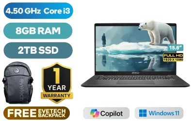 MSI Modern 15 F13MG Intel Core i3-1315U up to 4.50GHz Processor, 10MB Cache, 6x Cores, 8x Threads / 8GB DDR4 RAM / 2TB NVMe PCIe SSD / 15.6" FHD (1920 x 1080) IPS-Level Display / Intel UHD Graphics / Windows 11 Home / Intel Wi-Fi 6E Wireless LAN / Bluetooth 5.3 / 720p HD Camera with Webcam Shutter / 3x USB Type-A / 1x USB Type-C (Supports DisplayPort / Power Delivery 3.0) / 1x HDMI / 1x Microphone & Headphone Combo Jack / 1x RJ-45 Ethernet LAN / 1x Micro SD Card Reader / Kensington Lock / Single White Backlit Keyboard / 2x 2W Speakers / 1-Year Warranty / MSI Modern 15 F13MG-849ZA Intel Core i3 Laptop DealMSI Modern 15 F13MG Intel Core i3-1315U up to 4.50GHz Processor, 10MB Cache, 6x Cores, 8x Threads / 8GB DDR4 RAM / 2TB NVMe PCIe SSD / 15.6" FHD (1920 x 1080) IPS-Level Display / Intel UHD Graphics / Windows 11 Home / Intel Wi-Fi 6E Wireless LAN / Bluetooth 5.3 / 720p HD Camera with Webcam Shutter / 3x USB Type-A / 1x USB Type-C (Supports DisplayPort / Power Delivery 3.0) / 1x HDMI / 1x Microphone & Headphone Combo Jack / 1x RJ-45 Ethernet LAN / 1x Micro SD Card Reader / Kensington Lock / Single White Backlit Keyboard / 2x 2W Speakers / 1-Year Warranty / MSI Modern 15 F13MG-849ZA Intel Core i3 Laptop Deal [Modern-15-F13MG-849ZA/2TB] / [+] GET FREE EVETECH FLUX Premium Gaming Backpack+ FREE DELIVERY !