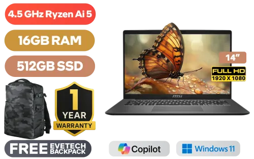 MSI Modern A14 AI+ F3HMG AMD Ryzen AI 5-330 up to 4.5GHz Processor, 12MB Cache, 4x Cores, 8x Threads / 16GB DDR5 RAM / 512GB Ultra-Fast NVMe SSD / 14" FHD (1920x1080) IPS-Level Display / Integrated Radeon 820M Graphics / Windows 11 Home (64bit) / RZ616 WiFi 6E Wireless LAN / Bluetooth 5.3 / 720P HD IR Camera with Privacy Shutter / 2x USB Type-A / 2x USB Type-C (Supports DisplayPort / Power Delivery 3.0) / 1 x HDMI / 1x Headphone and Microphone Combo Jack / 1x RJ-45 / 1x MicroSD Card Reader / White Backlit Keyboard / 2x Integrated Speakers / 1 Year Warranty / MSI Modern A14 AI+ F3HMG Ryzen AI 5 Laptop DealsMSI Modern A14 AI+ F3HMG AMD Ryzen AI 5-330 up to 4.5GHz Processor, 12MB Cache, 4x Cores, 8x Threads / 16GB DDR5 RAM / 512GB Ultra-Fast NVMe SSD / 14" FHD (1920x1080) IPS-Level Display / Integrated Radeon 820M Graphics / Windows 11 Home (64bit) / RZ616 WiFi 6E Wireless LAN / Bluetooth 5.3 / 720P HD IR Camera with Privacy Shutter / 2x USB Type-A / 2x USB Type-C (Supports DisplayPort / Power Delivery 3.0) / 1 x HDMI / 1x Headphone and Microphone Combo Jack / 1x RJ-45 / 1x MicroSD Card Reader / White Backlit Keyboard / 2x Integrated Speakers / 1 Year Warranty / MSI Modern A14 AI+ F3HMG Ryzen AI 5 Laptop Deals [MODERN A14 AI+ F3HMG-012ZA] / [+] GET FREE EVETECH DASH Premium Gaming Backpack+ FREE DELIVERY !