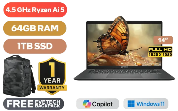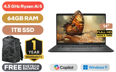 MSI Modern A14 AI+ F3HMG AMD Ryzen AI 5-330 up to 4.5GHz Processor, 12MB Cache, 4x Cores, 8x Threads / 64GB DDR5 RAM / 1TB Ultra-Fast NVMe SSD / 14" FHD (1920x1080) IPS-Level Display / Integrated Radeon 820M Graphics / Windows 11 Home (64bit) / RZ616 WiFi 6E Wireless LAN / Bluetooth 5.3 / 720P HD IR Camera with Privacy Shutter / 2x USB Type-A / 2x USB Type-C (Supports DisplayPort / Power Delivery 3.0) / 1 x HDMI / 1x Headphone and Microphone Combo Jack / 1x RJ-45 / 1x MicroSD Card Reader / White Backlit Keyboard / 2x Integrated Speakers / 1 Year Warranty / MSI Modern A14 AI+ F3HMG Ryzen AI 5 Laptop DealsMSI Modern A14 AI+ F3HMG AMD Ryzen AI 5-330 up to 4.5GHz Processor, 12MB Cache, 4x Cores, 8x Threads / 64GB DDR5 RAM / 1TB Ultra-Fast NVMe SSD / 14" FHD (1920x1080) IPS-Level Display / Integrated Radeon 820M Graphics / Windows 11 Home (64bit) / RZ616 WiFi 6E Wireless LAN / Bluetooth 5.3 / 720P HD IR Camera with Privacy Shutter / 2x USB Type-A / 2x USB Type-C (Supports DisplayPort / Power Delivery 3.0) / 1 x HDMI / 1x Headphone and Microphone Combo Jack / 1x RJ-45 / 1x MicroSD Card Reader / White Backlit Keyboard / 2x Integrated Speakers / 1 Year Warranty / MSI Modern A14 AI+ F3HMG Ryzen AI 5 Laptop Deals [MODERN A14 AI+ F3HMG-012ZA/64GB/1TB] / [+] GET FREE EVETECH DASH Premium Gaming Backpack+ FREE DELIVERY !