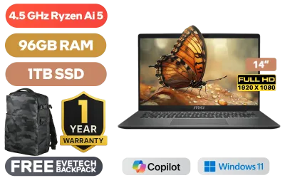 MSI Modern A14 AI+ F3HMG AMD Ryzen AI 5-330 up to 4.5GHz Processor, 12MB Cache, 4x Cores, 8x Threads / 96GB DDR5 RAM / 1TB Ultra-Fast NVMe SSD / 14" FHD (1920x1080) IPS-Level Display / Integrated Radeon 820M Graphics / Windows 11 Home (64bit) / RZ616 WiFi 6E Wireless LAN / Bluetooth 5.3 / 720P HD IR Camera with Privacy Shutter / 2x USB Type-A / 2x USB Type-C (Supports DisplayPort / Power Delivery 3.0) / 1 x HDMI / 1x Headphone and Microphone Combo Jack / 1x RJ-45 / 1x MicroSD Card Reader / White Backlit Keyboard / 2x Integrated Speakers / 1 Year Warranty / MSI Modern A14 AI+ F3HMG Ryzen AI 5 Laptop DealsMSI Modern A14 AI+ F3HMG AMD Ryzen AI 5-330 up to 4.5GHz Processor, 12MB Cache, 4x Cores, 8x Threads / 96GB DDR5 RAM / 1TB Ultra-Fast NVMe SSD / 14" FHD (1920x1080) IPS-Level Display / Integrated Radeon 820M Graphics / Windows 11 Home (64bit) / RZ616 WiFi 6E Wireless LAN / Bluetooth 5.3 / 720P HD IR Camera with Privacy Shutter / 2x USB Type-A / 2x USB Type-C (Supports DisplayPort / Power Delivery 3.0) / 1 x HDMI / 1x Headphone and Microphone Combo Jack / 1x RJ-45 / 1x MicroSD Card Reader / White Backlit Keyboard / 2x Integrated Speakers / 1 Year Warranty / MSI Modern A14 AI+ F3HMG Ryzen AI 5 Laptop Deals [MODERN A14 AI+ F3HMG-012ZA/96GB/1TB] / [+] GET FREE EVETECH DASH Premium Gaming Backpack+ FREE DELIVERY !