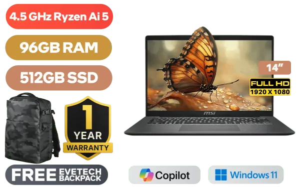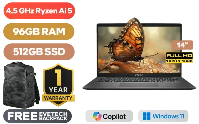 MSI Modern A14 AI+ F3HMG AMD Ryzen AI 5-330 up to 4.5GHz Processor, 12MB Cache, 4x Cores, 8x Threads / 96GB DDR5 RAM / 512GB Ultra-Fast NVMe SSD / 14" FHD (1920x1080) IPS-Level Display / Integrated Radeon 820M Graphics / Windows 11 Home (64bit) / RZ616 WiFi 6E Wireless LAN / Bluetooth 5.3 / 720P HD IR Camera with Privacy Shutter / 2x USB Type-A / 2x USB Type-C (Supports DisplayPort / Power Delivery 3.0) / 1 x HDMI / 1x Headphone and Microphone Combo Jack / 1x RJ-45 / 1x MicroSD Card Reader / White Backlit Keyboard / 2x Integrated Speakers / 1 Year Warranty / MSI Modern A14 AI+ F3HMG Ryzen AI 5 Laptop DealsMSI Modern A14 AI+ F3HMG AMD Ryzen AI 5-330 up to 4.5GHz Processor, 12MB Cache, 4x Cores, 8x Threads / 96GB DDR5 RAM / 512GB Ultra-Fast NVMe SSD / 14" FHD (1920x1080) IPS-Level Display / Integrated Radeon 820M Graphics / Windows 11 Home (64bit) / RZ616 WiFi 6E Wireless LAN / Bluetooth 5.3 / 720P HD IR Camera with Privacy Shutter / 2x USB Type-A / 2x USB Type-C (Supports DisplayPort / Power Delivery 3.0) / 1 x HDMI / 1x Headphone and Microphone Combo Jack / 1x RJ-45 / 1x MicroSD Card Reader / White Backlit Keyboard / 2x Integrated Speakers / 1 Year Warranty / MSI Modern A14 AI+ F3HMG Ryzen AI 5 Laptop Deals [MODERN A14 AI+ F3HMG-012ZA/96GB] / [+] GET FREE EVETECH DASH Premium Gaming Backpack+ FREE DELIVERY !