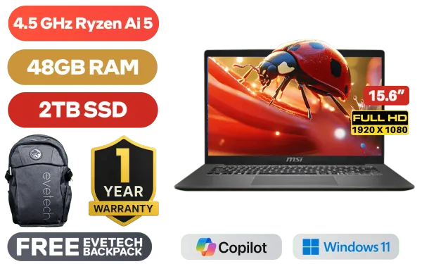 MSI Modern A15 AI+ F3HMG AMD Ryzen AI 5-330 up to 4.5GHz Processor, 12MB Cache, 4x Cores, 8x Threads / 48GB DDR5 RAM / 2TB Ultra-Fast NVMe SSD / 15.6" FHD (1920x1080) IPS-Level Display / Integrated AMD Radeon 820M Graphics / Windows 11 Home (64bit) / RZ616 WiFi 6E Wireless LAN / Bluetooth 5.3 / 720P HD IR Camera with Privacy Shutter / 2x USB Type-A / 2x USB Type-C (Supports DisplayPort / Power Delivery 3.0) / 1 x HDMI / 1x Headphone and Microphone Combo Jack / 1x RJ-45 / 1x MicroSD Card Reader / White Backlit Keyboard / 2x Integrated Speakers / 1 Year Warranty / MSI Modern A15 AI+ F3HMG Ryzen AI 5 Laptop DealsMSI Modern A15 AI+ F3HMG AMD Ryzen AI 5-330 up to 4.5GHz Processor, 12MB Cache, 4x Cores, 8x Threads / 48GB DDR5 RAM / 2TB Ultra-Fast NVMe SSD / 15.6" FHD (1920x1080) IPS-Level Display / Integrated AMD Radeon 820M Graphics / Windows 11 Home (64bit) / RZ616 WiFi 6E Wireless LAN / Bluetooth 5.3 / 720P HD IR Camera with Privacy Shutter / 2x USB Type-A / 2x USB Type-C (Supports DisplayPort / Power Delivery 3.0) / 1 x HDMI / 1x Headphone and Microphone Combo Jack / 1x RJ-45 / 1x MicroSD Card Reader / White Backlit Keyboard / 2x Integrated Speakers / 1 Year Warranty / MSI Modern A15 AI+ F3HMG Ryzen AI 5 Laptop Deals [MODERN A15 AI+ F3HMG-012ZA/48GB/2TB] / [+] GET FREE EVETECH FLUX Premium Gaming Backpack+ FREE DELIVERY !